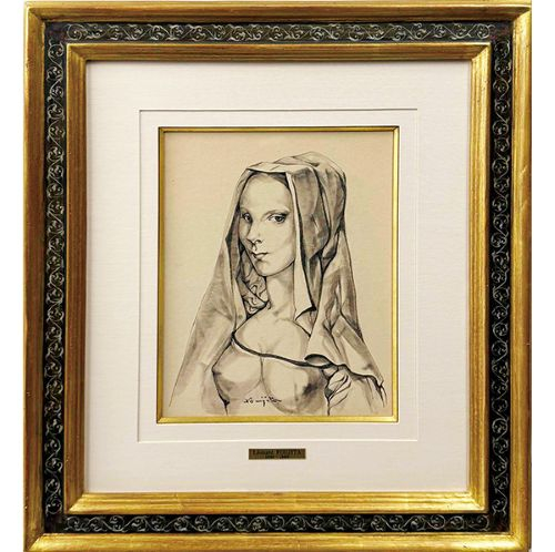 藤田 嗣治 「ヴェールを被った婦人」 墨 310×230mm 東京美術俱楽部鑑定書付