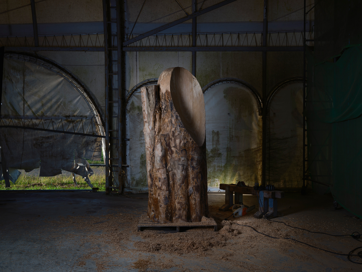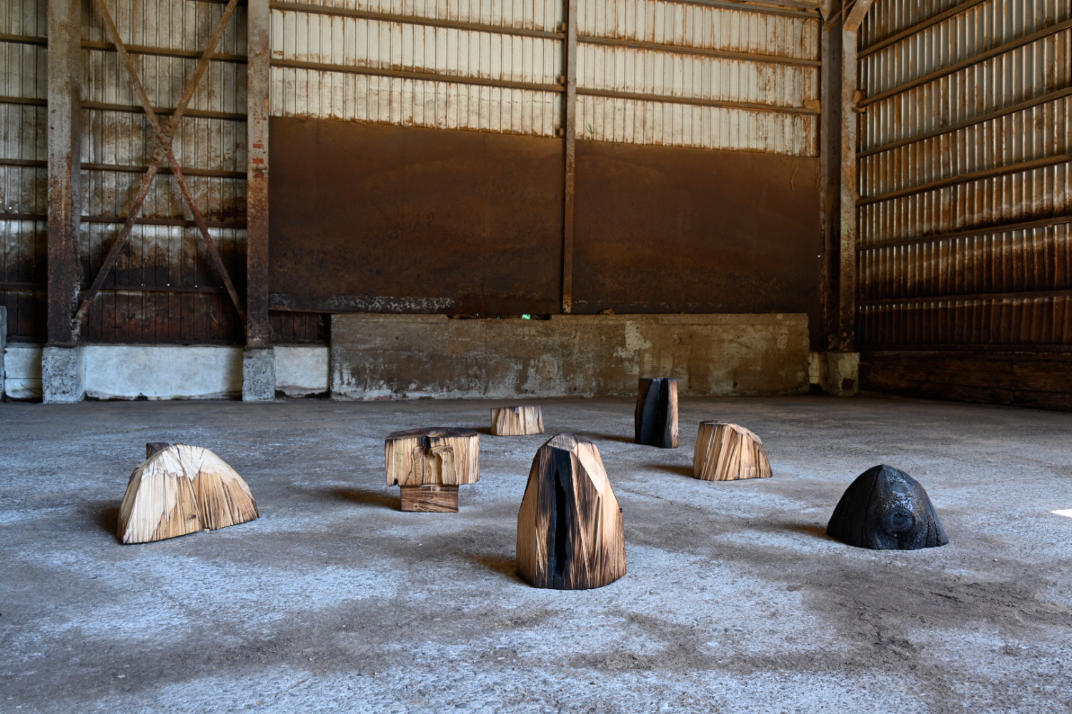 下北のヒバを使った新作 《7 sculpture sketches》制作⾵景 2025年8⽉15⽇ 北海道・⾶⽣のアトリエ 撮影:国松希根太