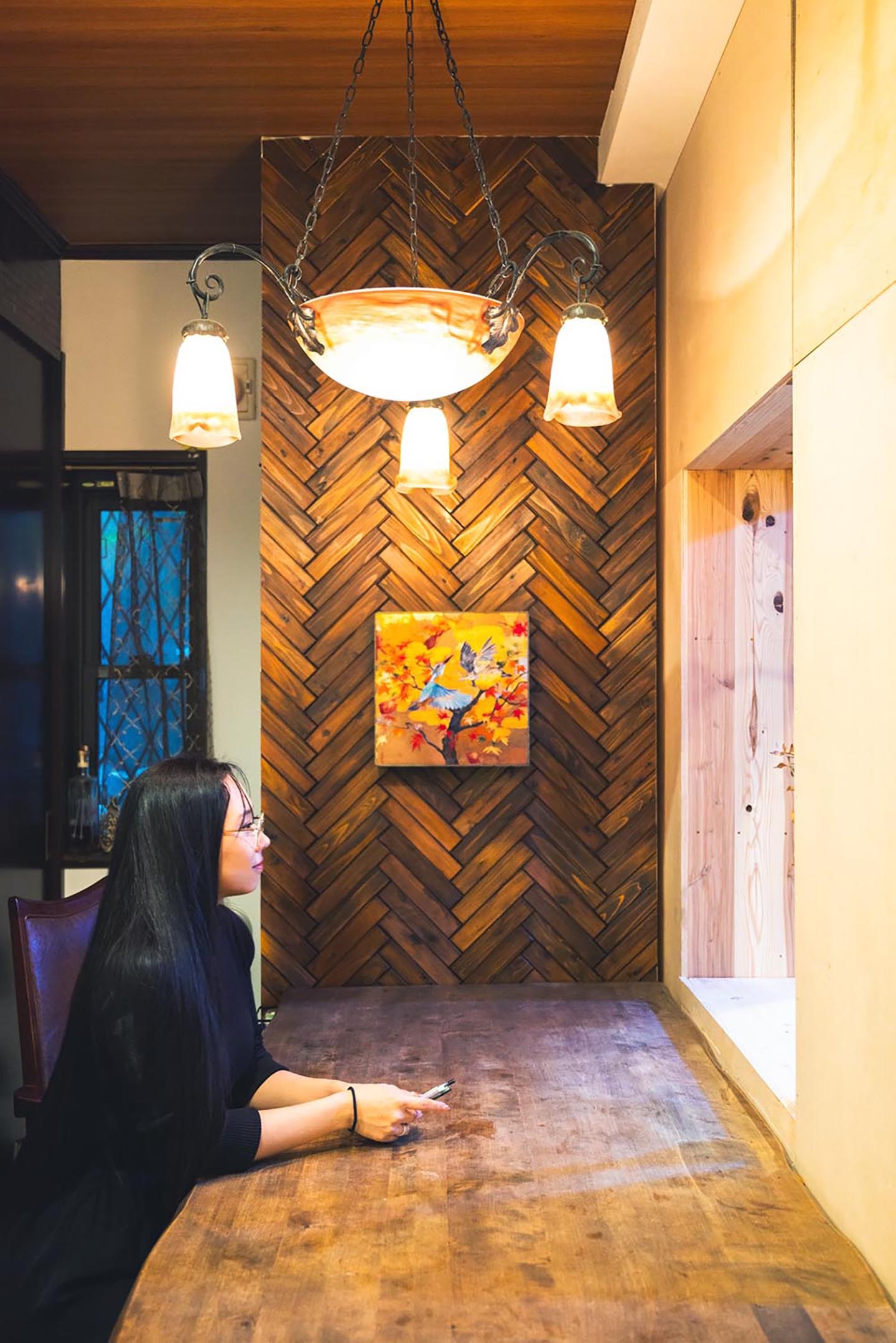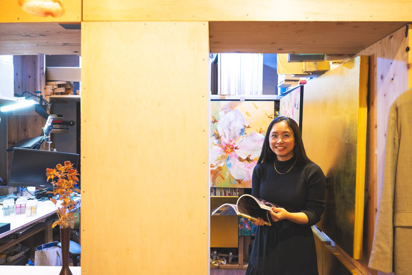 曽祖母が住んでいた一室を、自分と夫でアトリエに改造しました。ダイニングテーブルからアトリエを四角い窓で覗ける構造にしています。食卓にいる夫が、額縁越しに絵を見ているように、私のアトリエを見るというコンセプトで設計しました。絵の中で、絵を描くような空間が気に入っています。