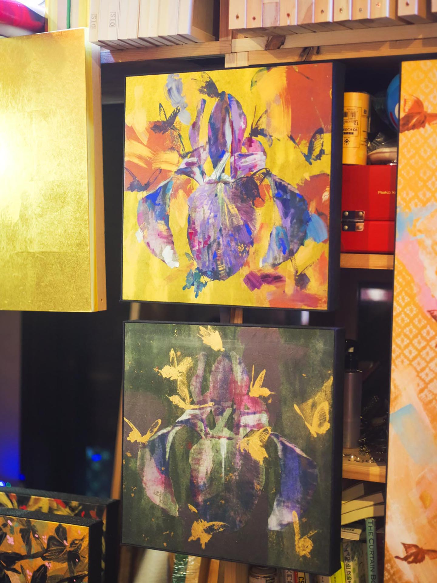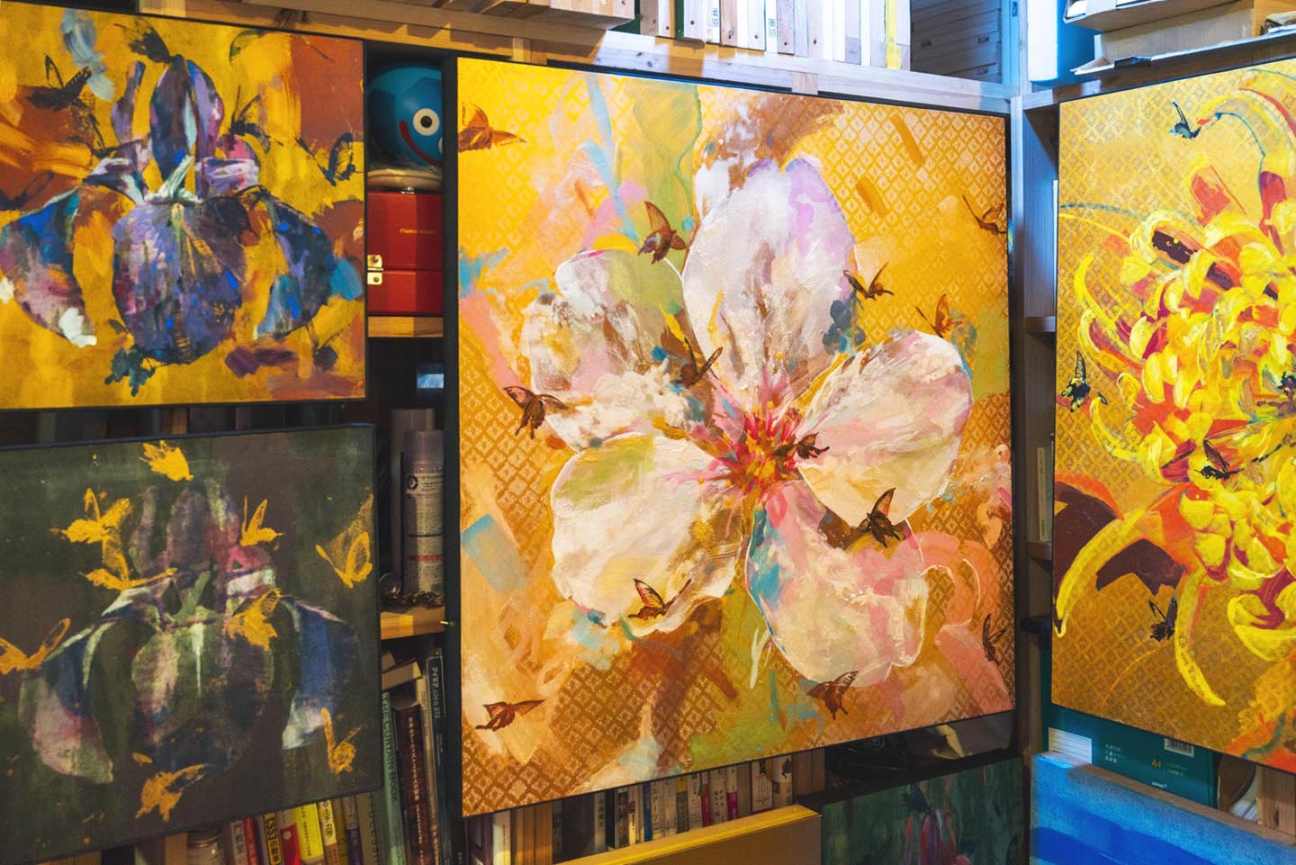 「金箔や和紙に日本的な文様(七宝柄、麻の葉紋様、菱形紋様など)を入れることで、パターンとしての美しさと日本の伝統を強調しています。そうすることで、それ以外の世界観(抽象表現など)との組み合わせを際立たせています」