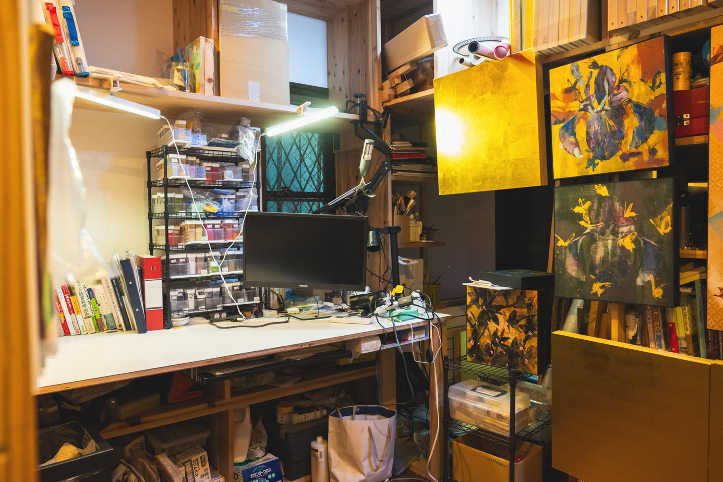 会社の仕事はリモートが多く、アトリエのパソコンで仕事もしているという