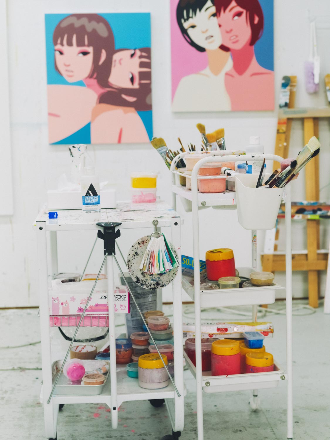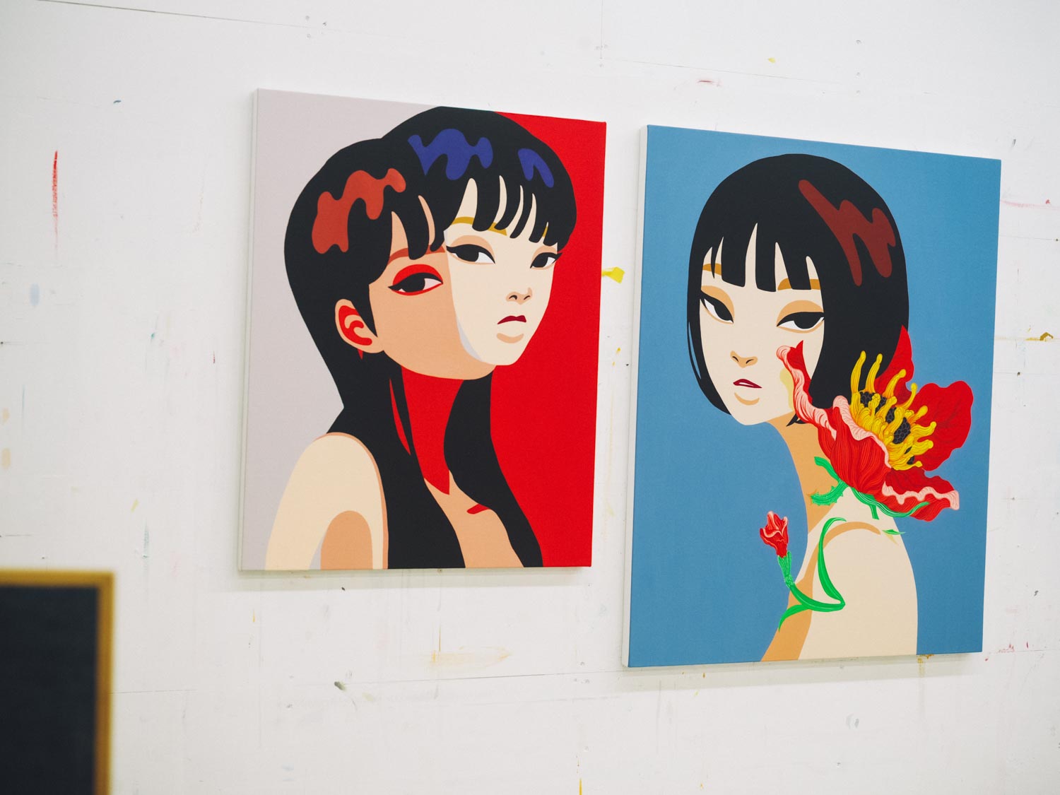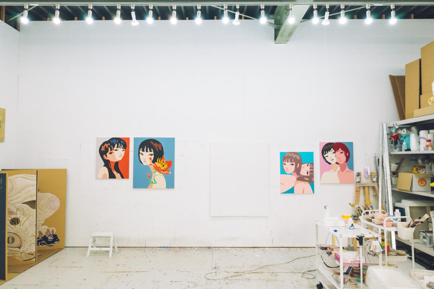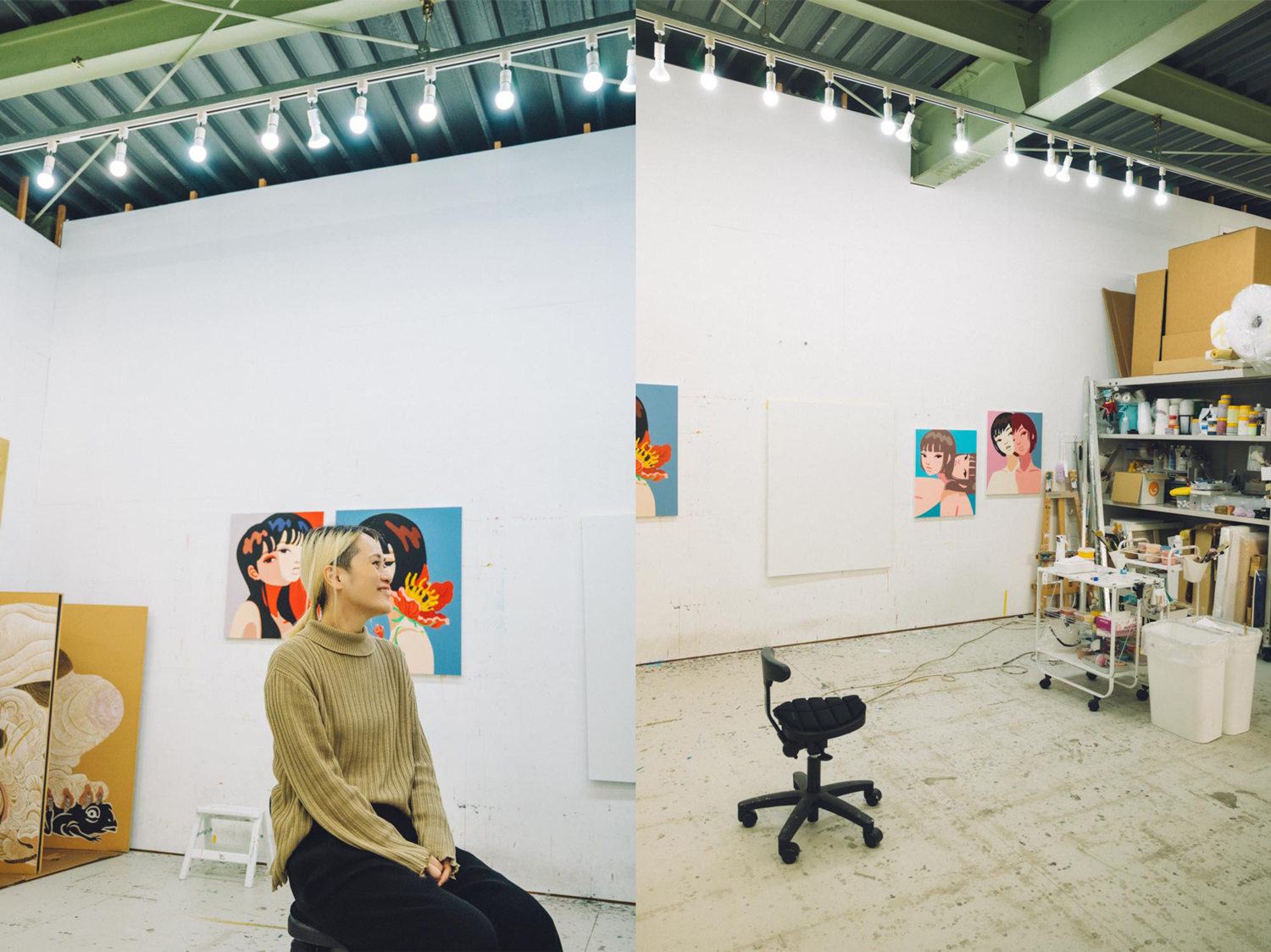 現在のアトリエは3年ほど使用している。「たまたま見つけたこの場所は、天井が高くて居心地も良かったんです。広い空間の方が気持ちも抜けるし、制作中も作品が実際の展示空間と同じような大きさに感じられるので、展示イメージがつかみやすく制作も捗ります。白壁は自分たちで塗ったもので、ギャラリーのような雰囲気があるから、展示するときのことをイメージしながら描けるんです」