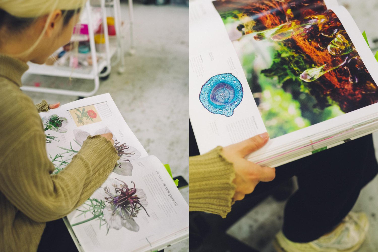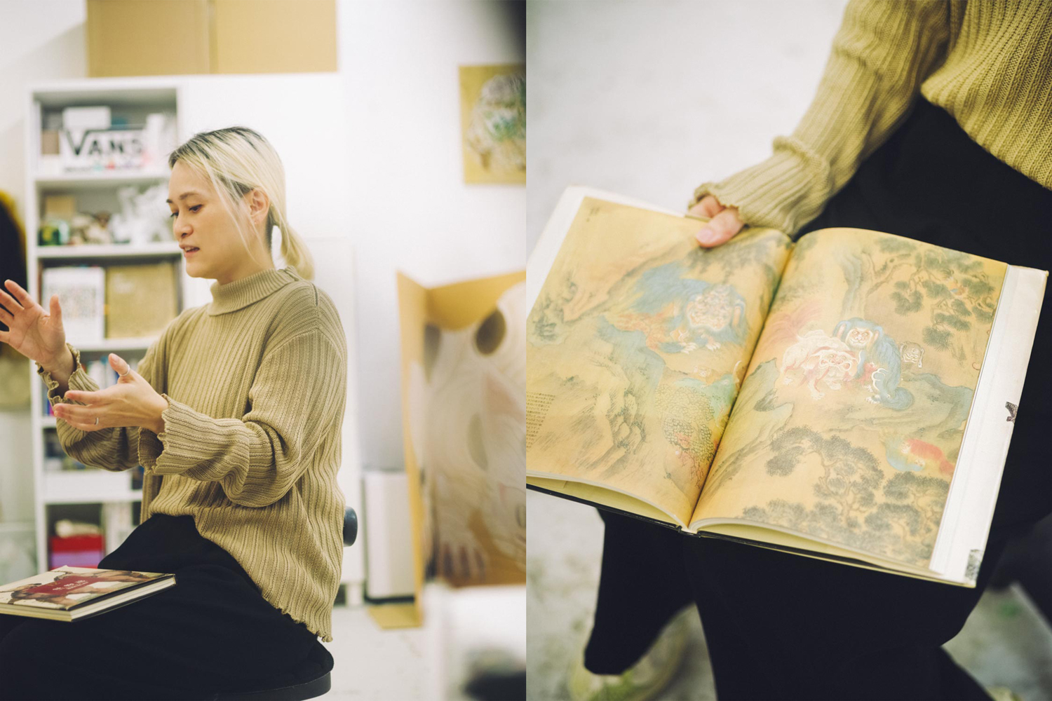 アトリエの本棚から『怪物誌(Fantastic Dozen 12)』を取り出し、開明獣のページを開いたfeebeeさん。「当時は怖くて仕方なかったんです。でも大人になると全然怖くない。なのに“怖かった感情”だけ残っていて」。その感覚が、現在の“見えないものを可視化する”表現の原点になっている