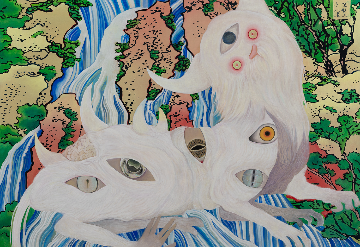 「最近発表した《re Narrativeのためのプルラリティ001》では、これまで白沢を複眼的な視点や思考の象徴として描いてきたことに加えて、『多元的(プルラリティ)』という概念を重ねています。この作品の白沢は、異なる視点や物語が交差し、共存しうる空間そのものを象徴する存在です。背景には北斎の滝を引用しています。私たちは滝を見たとき、無意識に“北斎の描いた滝”を重ねているかもしれない。誰かが物語を与えれば、そのイメージに縛られてしまうこともある。SNSで意味があふれる時代に、本当に多層の視点を持つ存在がいたらどのように世界を見るのか。そんなことを想像しながら描きました」