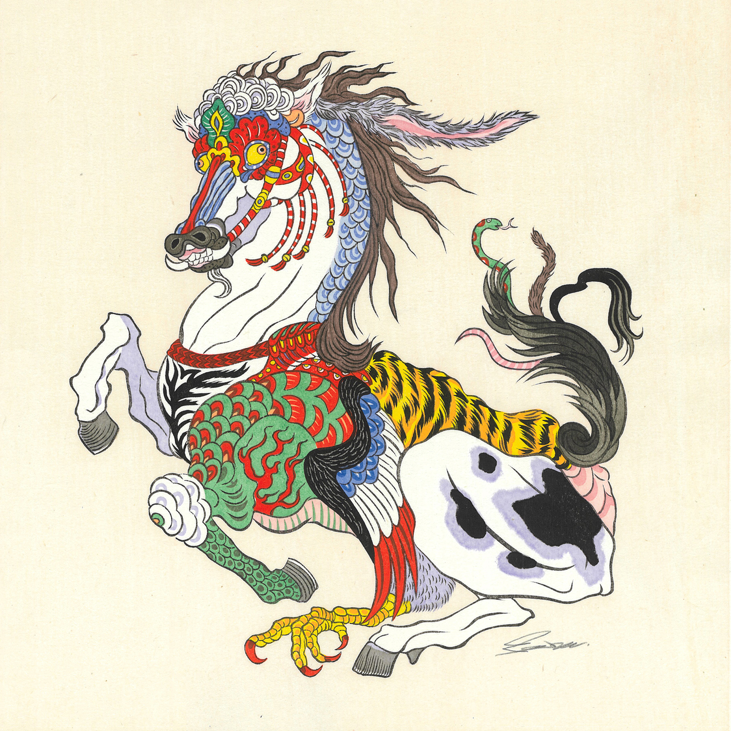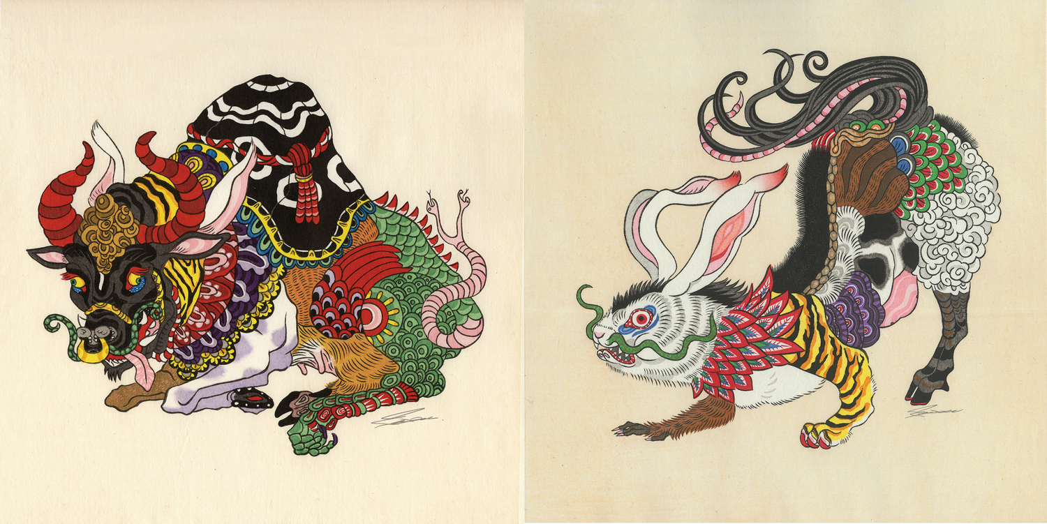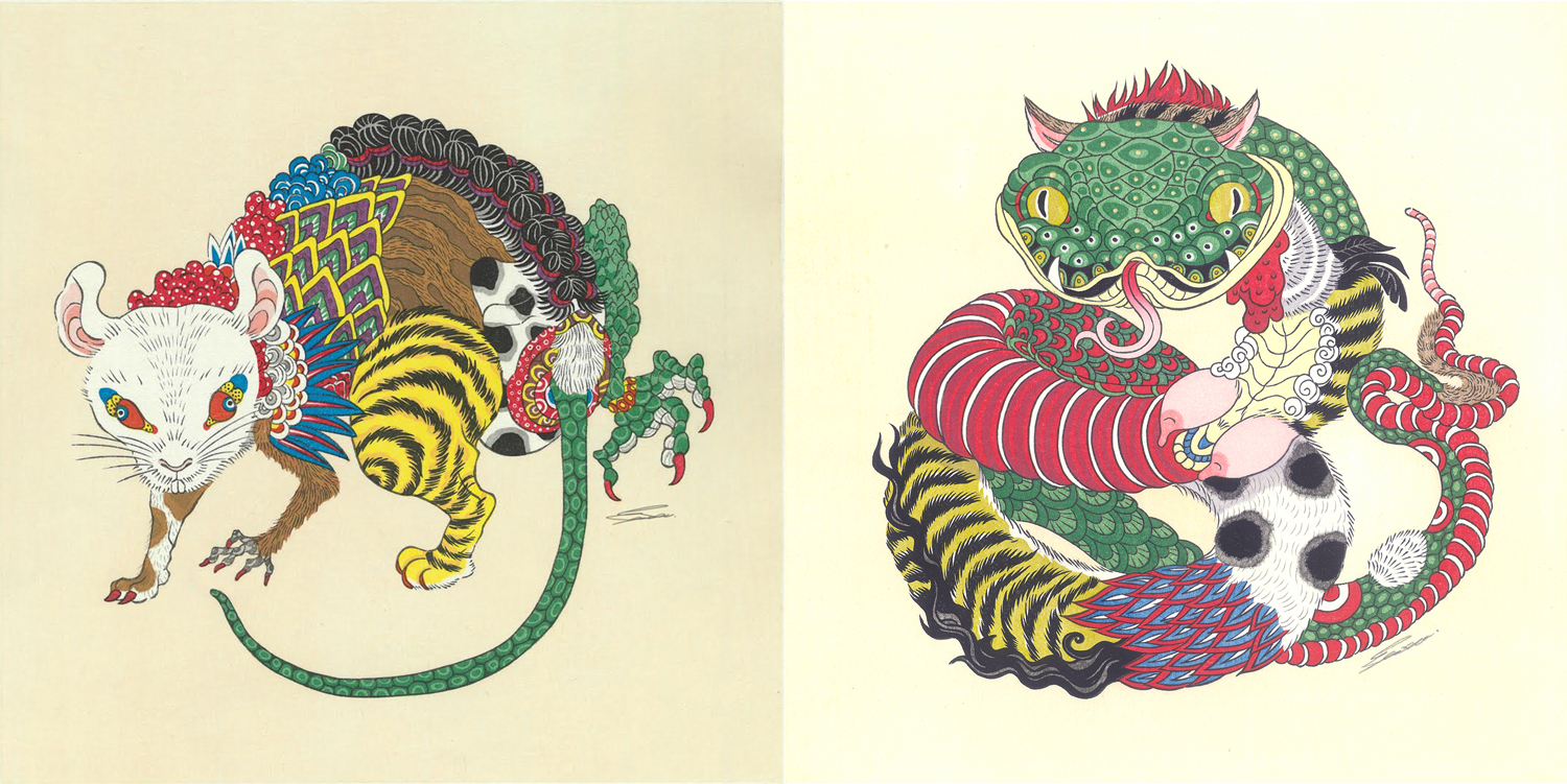 この《寿という獣》の木版画シリーズは、江戸時代の浮世絵《寿と云ふ獣》――「十二支を合成して新しい獣にする」という発想をもとに描いています。現代の作家である私が、江戸時代に制作された浮世絵から影響を受け、アダチ版画研究所と協働し、絵師・彫師・摺師という伝統的な工程を通しながら現代的な視点を加えて再構築するという行為そのものが、本シリーズのコンセプトにもなっています。