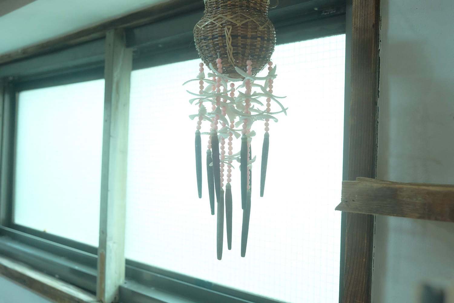 剥き出しのコンクリートや年季の入った木の柱が残るこぢんまりとした空間で、山中さんは筆を動かしている。制作の背景やプロセス、そして棚の片隅に並ぶ骨董品について話をうかがった。