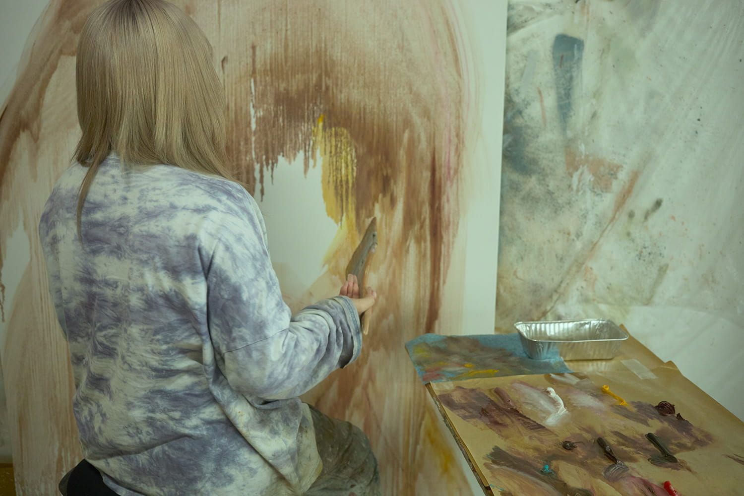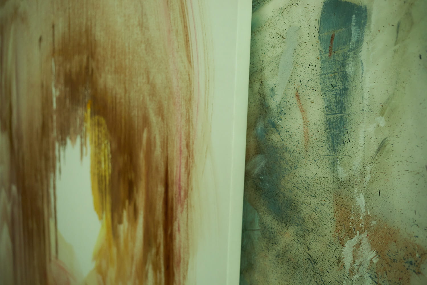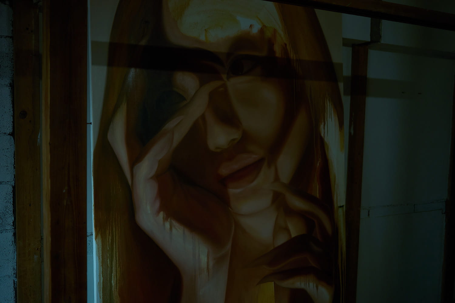 「人物を描くときは、事前に別の場所でモデルを撮影して、そこから白飛びさせたり色味を調整したり、歪みを整えたりしてイメージをつくります。それを見ながら、最初は絵の具を垂らして、色や雰囲気を大まかにトレースして一気に立ち上げていきます。描きながら、残すところと描き込むところを判断していって。次に具体的な部分を描き込み、最後にまた上から絵の具を垂らす。そうやって抽象と具象を行き来しながら描いていますね」