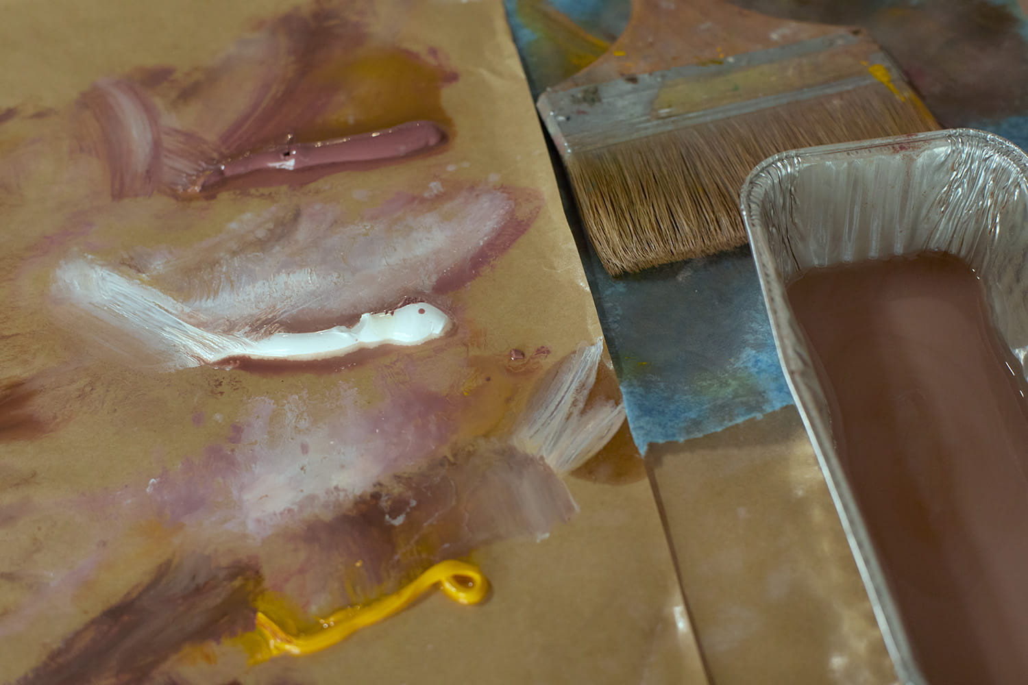 描く最中に生じる絵の具の垂れや、コントロールしきれない部分は、そのまま受け入れていくという。こうした“制御しきれない要素”は、下絵となるイメージをつくるモデル撮影の段階からすでに含まれている。