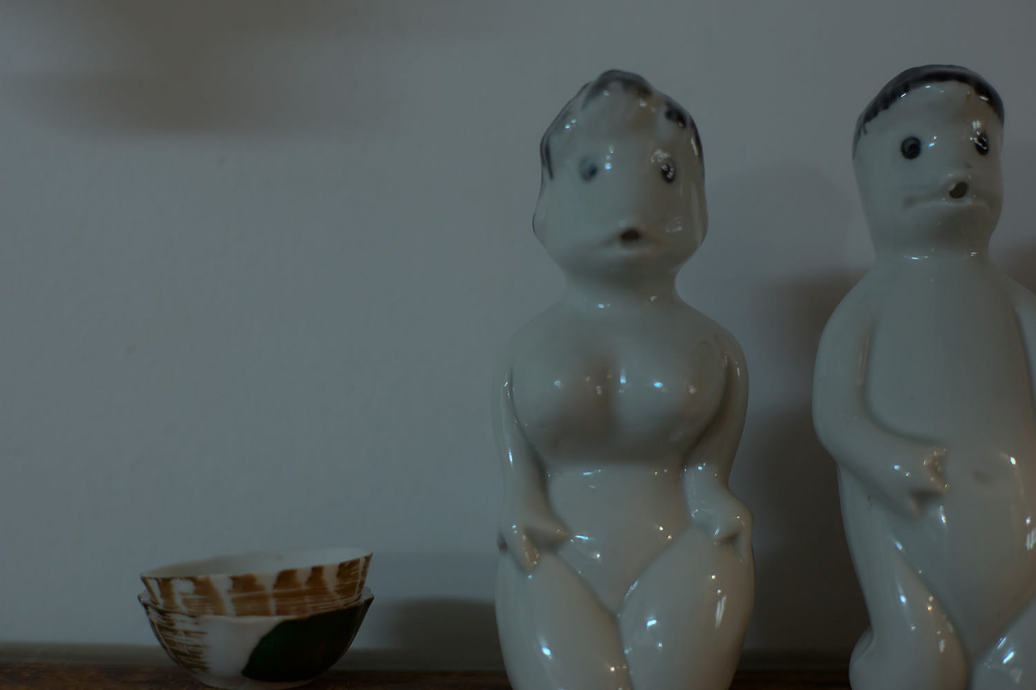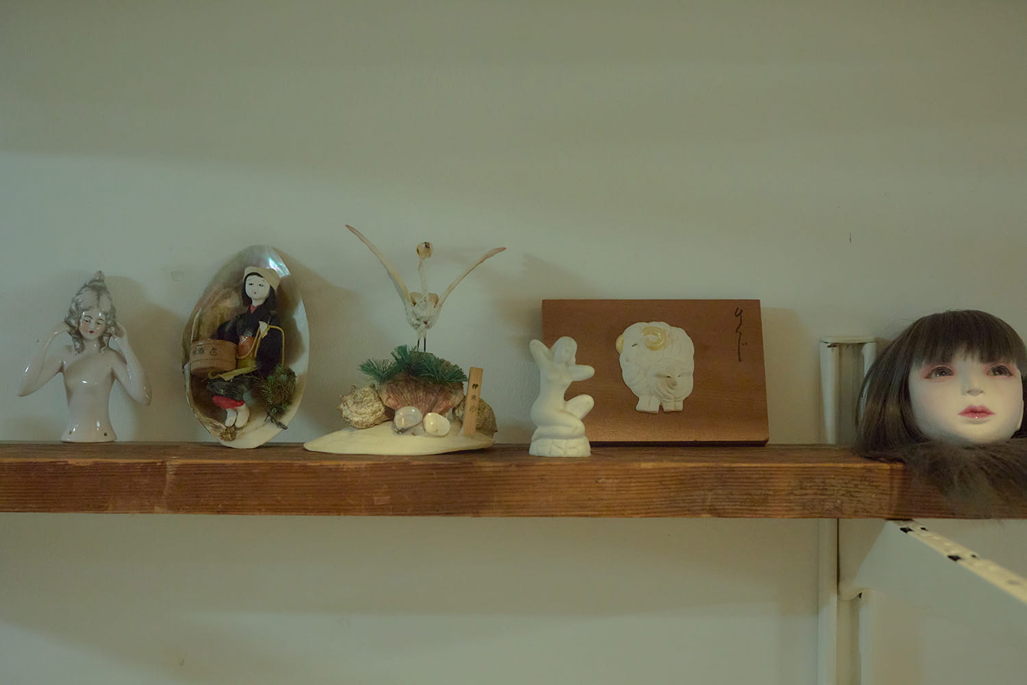 「陶器も人物も、描き方は同じにしています。自分が興味あるものとか、可愛いなって思うものしか描きたくないっていう感じで。ていうか、描けないんですけど(笑)。京都にいた大学時代から骨董品を集めるのが好きで、最近はヤフオクでいろいろ集めています」と語りながら、棚に並ぶコレクションをいくつか見せてくれた。