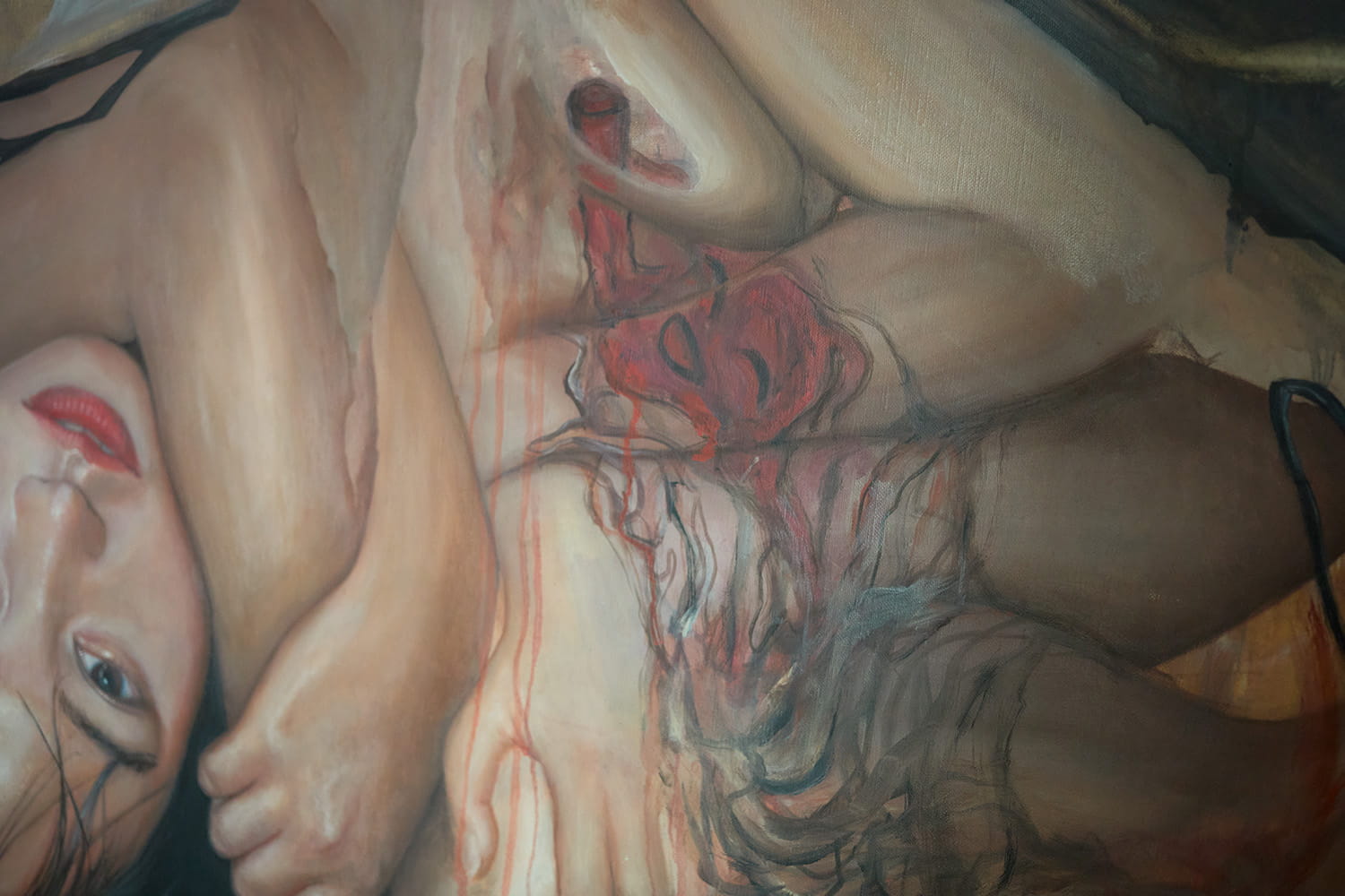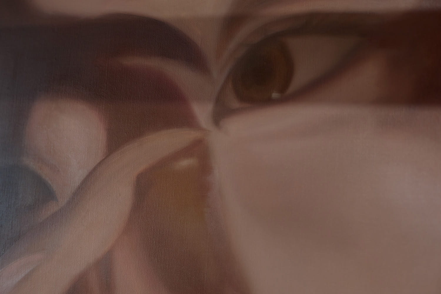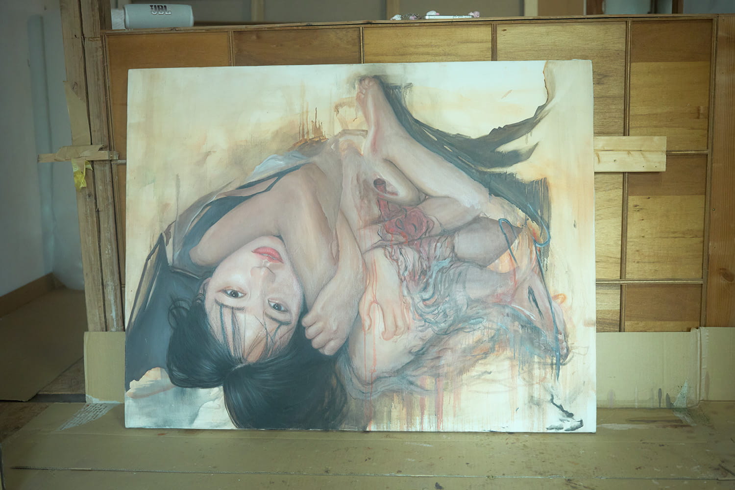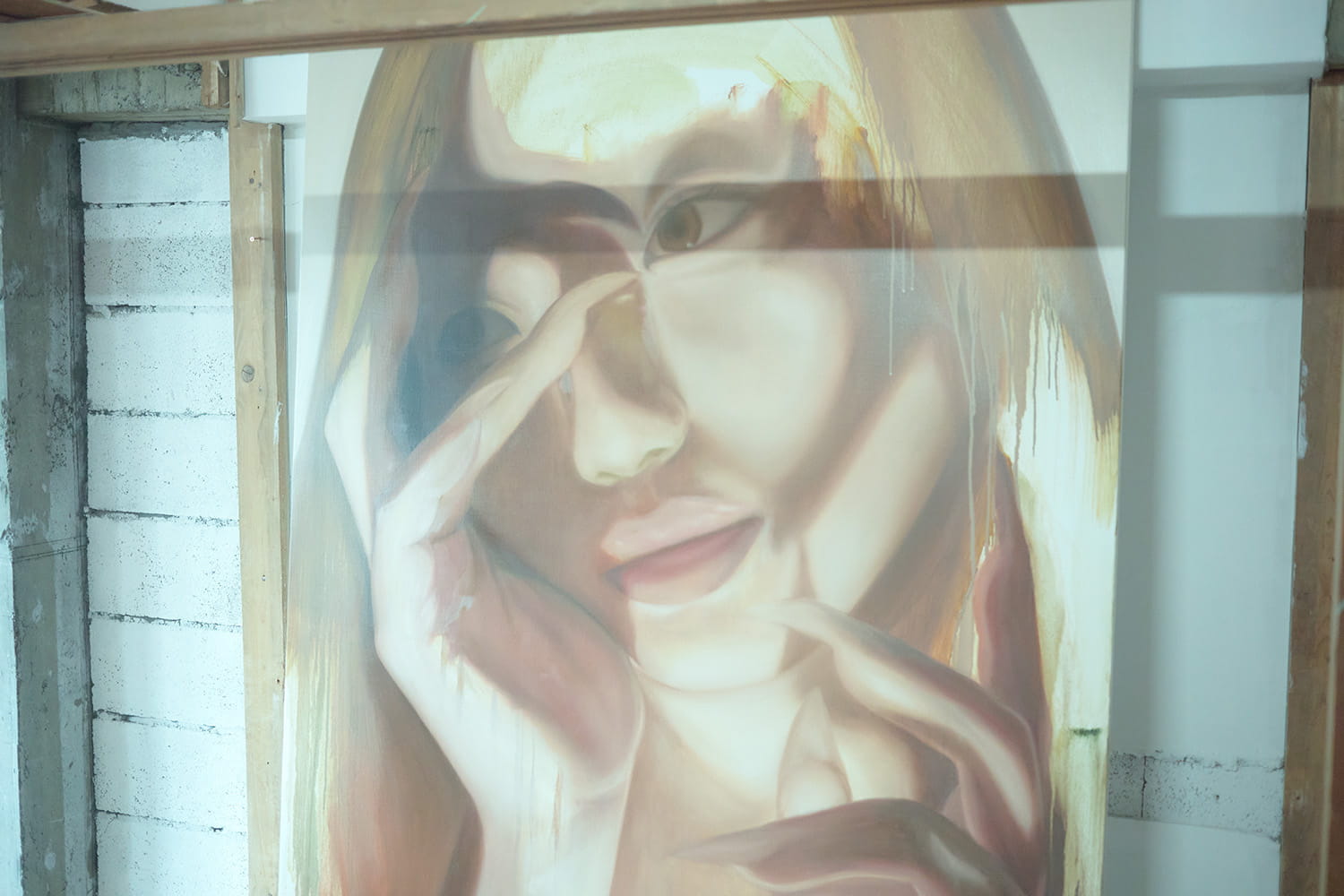 「学部生時代には、具象的に人を描いていました。人の身体と、その周りや内側に抽象的な内臓のようなものを描いてみたいと思っていたんです。ただ、このままだと人物像と抽象的な二つの表現がチグハグに見え、一枚の絵としての纏まりがないと考えていました。その経験をもとに、その二つの表現に纏まりを持たせる方法を試行錯誤しました。様々な実験の末、人物像自体の抽象度を上げることを意識し始めました。顔にブラシを当ててぼかしたり、髪の毛の線を描かないようになったり、大枠をベールみたいな、オーラのような感じで描くようになっていったり。自分が実現したいと思っているイメージが複数あり、一枚の絵画の上で何個もバラバラに点在させてしまっていたものを、全て人物像の内側に丸め込んで纏まりをつくるような形になったんです」