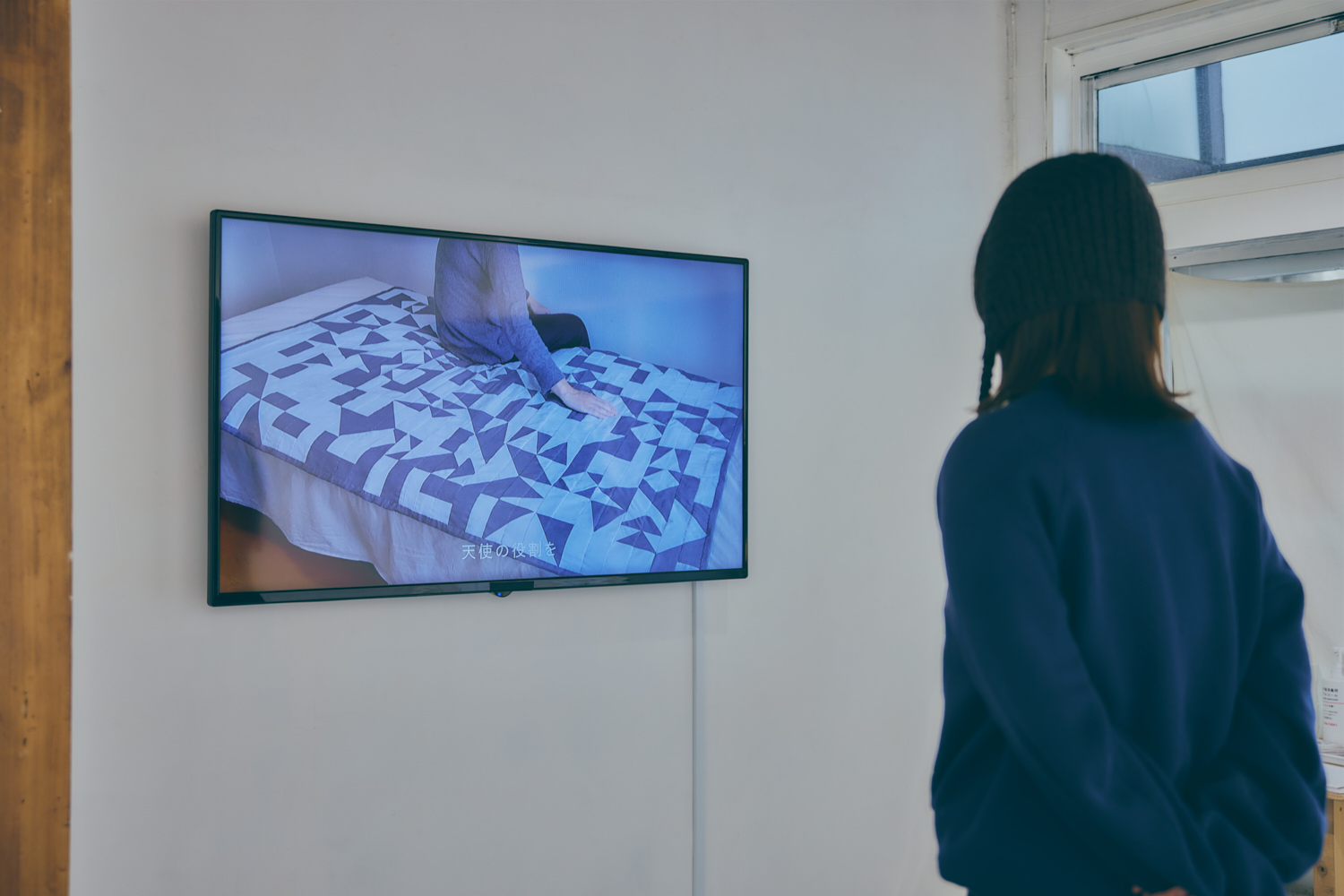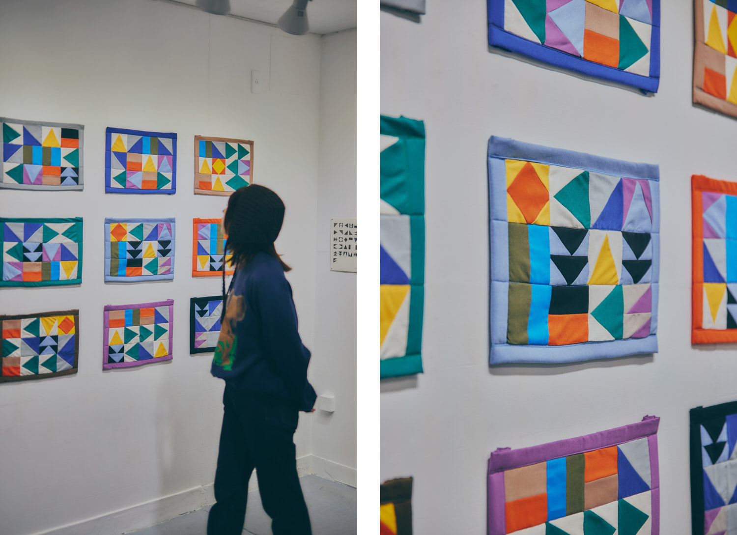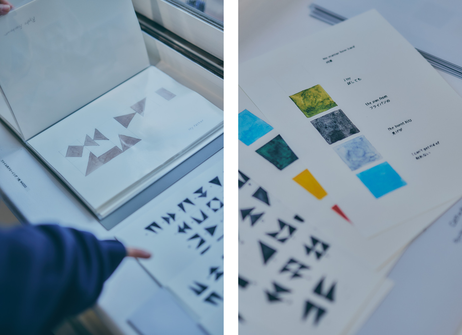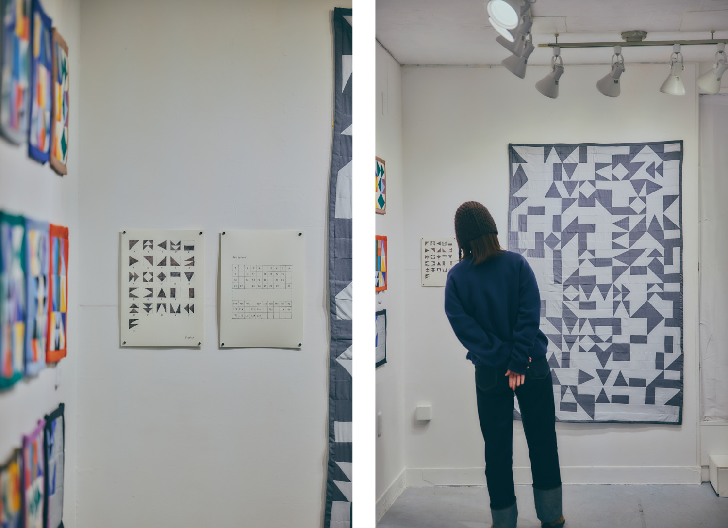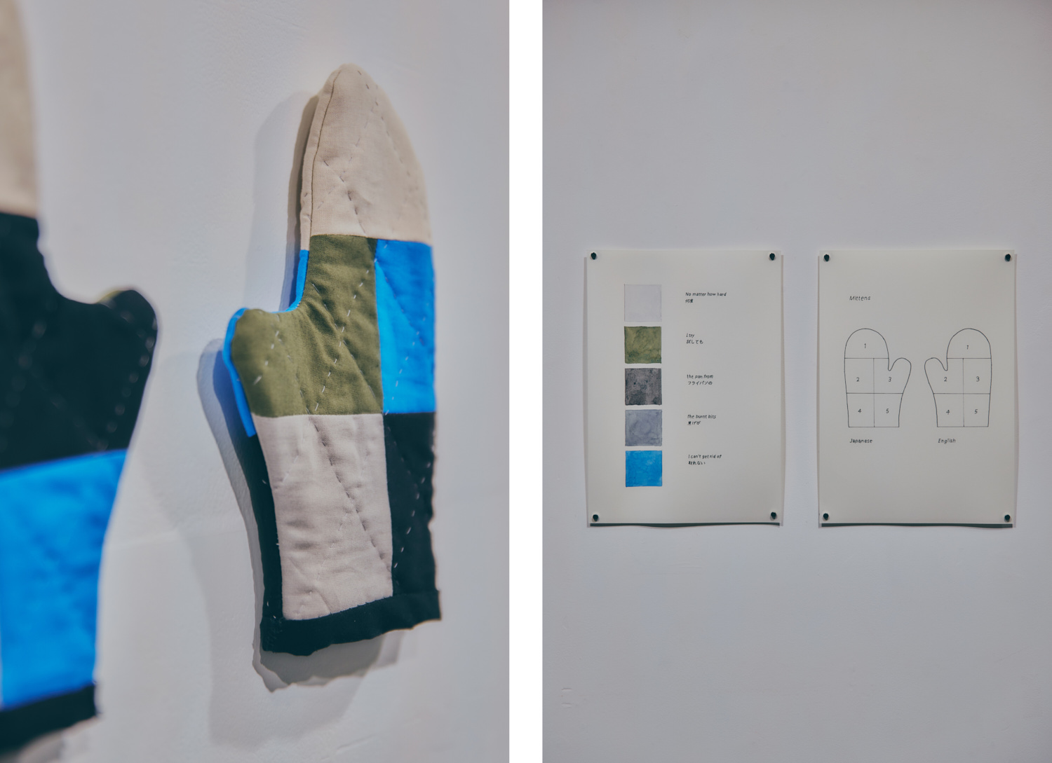 この展示では、私の友人に依頼して「話すほどではないけれど、言葉にすれば伝えられること」を集めています。それらの言葉を、布片の色や形の組み合わせによってあらわす「キルト語」という人工言語を創りました。それを読むには、日本語・英語・フランス語・アラビア語など、複数の言語に対応した変換表が必要で、ひとつのキルトに対して複数の読みが生まれます。例えばクッションの形をしたキルトでは、英語とフランス語の対応表を使用することで、それぞれ違う意味へと変化します。