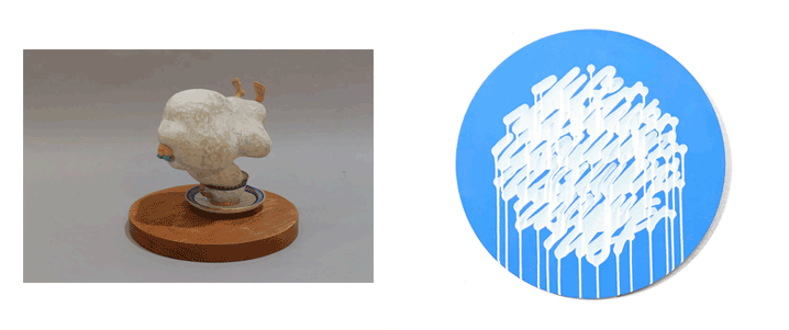 画像左からgallery UG「珈琲」野原邦彦本体:樟(大阪府産)、台座:杉(兵庫県産)、本体:30×27.5×22cm、台座:φ40×t4.1cm(2021年)hpgrp GALLERY TOKYO「Untitled」It's a living ・Acrylic and spray on canvas、50.8×50.8cm(2022年)