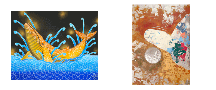 画像左からSHIBAYAMA ART GALLERY「殷賑」出口雄樹・ミクストメディア、72.7×60.6cm (2021年)Artglorieux GALLERY OF TOKYO「月を見る 宇宙兄弟コラボ作品」裕人礫翔 ・キャンパス地、本金箔、プラチナ箔、銀箔、84.1×59.4cm(2022年)