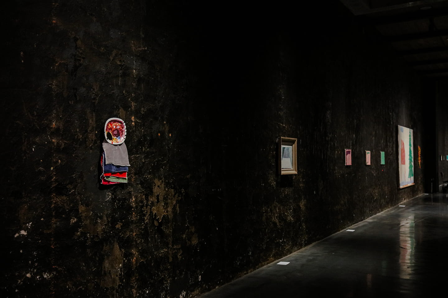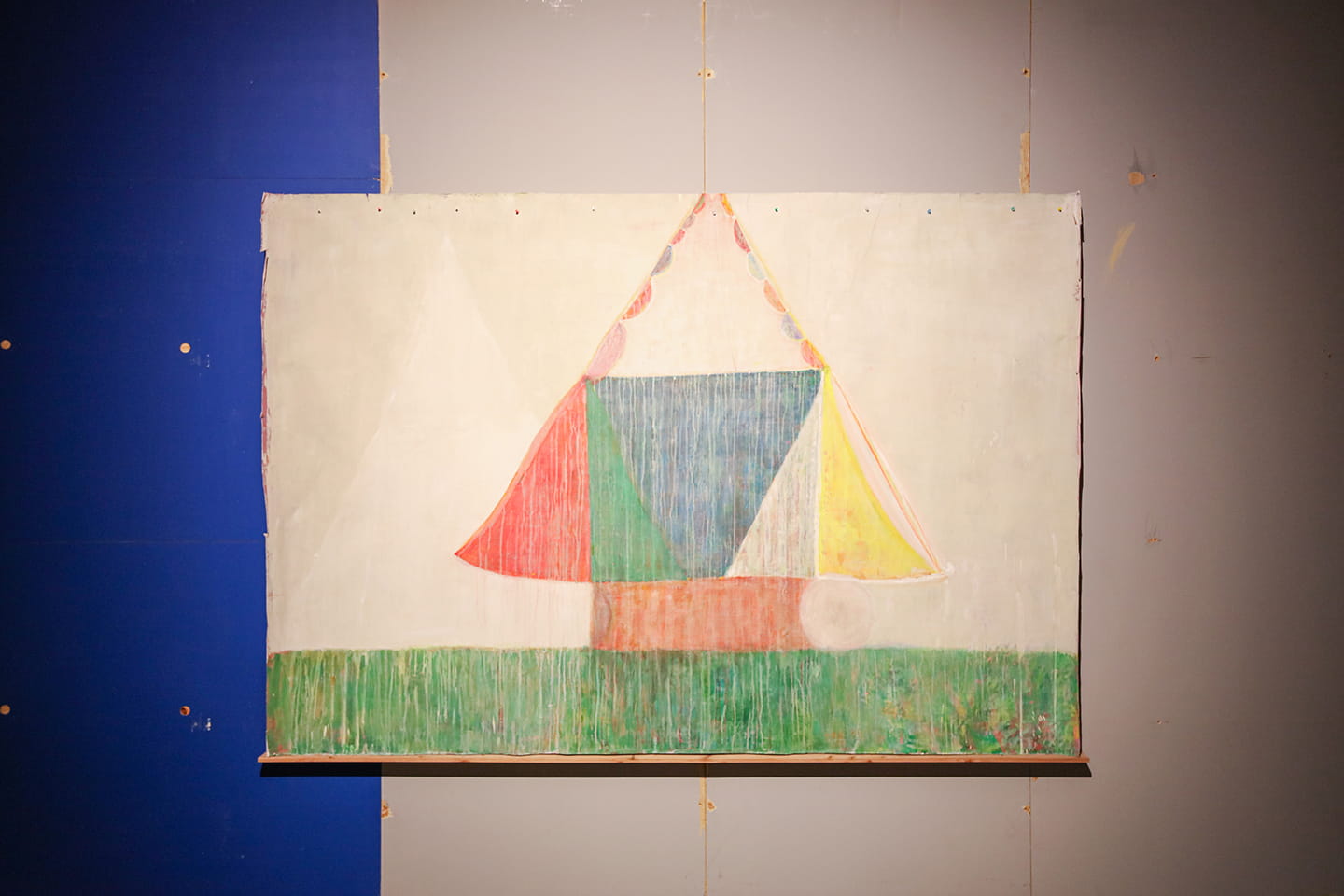 大きな紙に描かれた絵のへりには布や木材やまた別の紙が継ぎ足されている。その「えり」や「へり」によって、絵と壁の境目がより曖昧になり、いつもよりこころを開いて絵と向き合いたくなる。貼られた布のほつれ、足された板の木目。すべてのパーツが無秩序に、しかし確信をもってそこに置かれたのであろうという佇まいがあった。