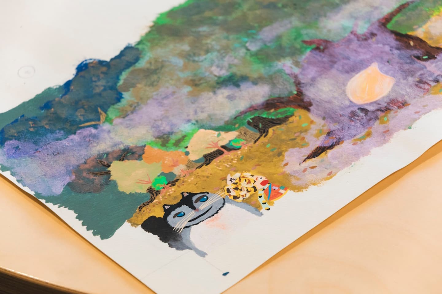 長田:そう。まさに壁に描いてる最中でした。ちょうどその頃、僕のなかに『ほろほろもみじ』の原型となる構想があったのだけど、「絵を描くのは自分じゃない」と思っていた。また、絵と文を自分だけで完結させない制作方法にもチャレンジしたい気持ちが芽生えていたこともあり、「『ほろほろもみじ』を誰に描いてもらうのがいいんだろう?」と、アンテナを張りながら日々を過ごしていたんです。そんなときに出会ったSUMIREさんが、鮮やかな色を、迷いなく重ねていっているように見えて。わあ、すごいなって、ずっと目が離せなかった。