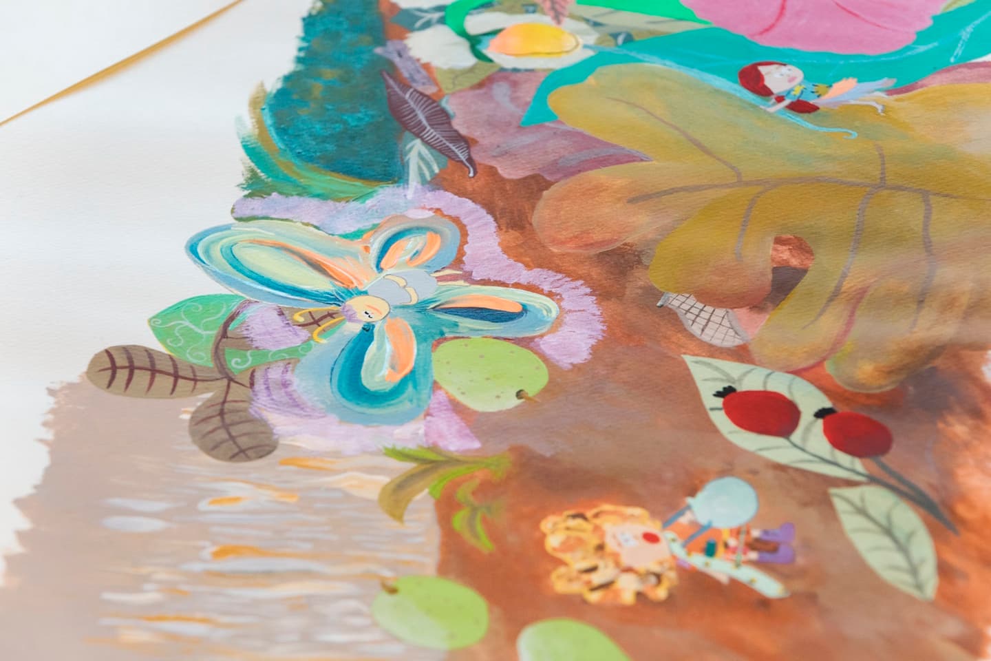 SUMIRE:やっぱり原画でしかわからない、色彩の表現を見てもらえたらうれしいです。絵の一つひとつに対して絵の具の色はそのまま使っておらず、配合しているのですが、ところどころで蛍光色やラメも使っています。たとえば、蝶の羽にオレンジの蛍光色を乗せたり、蝶の周りや木にかかるモヤに紫のラメを使ったり。
