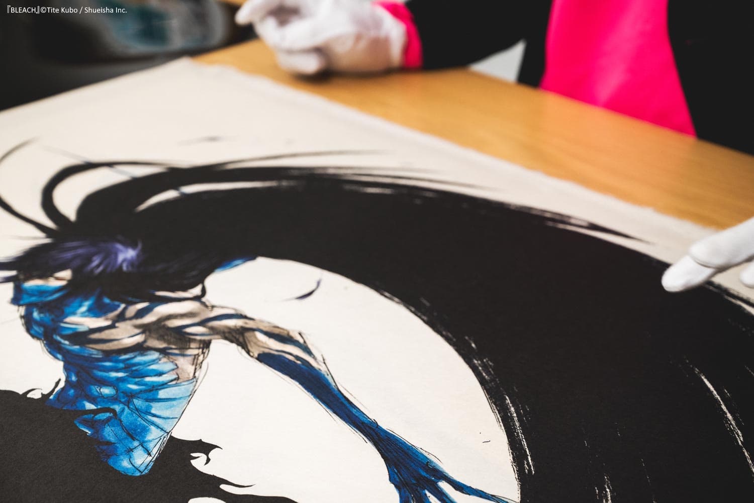 手漉き和紙にコロタイプでプリントした「The Millennium」シリーズは、「1000年先にマンガを伝える」ことをコンセプトにしています。久保帯人先生の「BLEACH/黒衣少年図」に続いて発表したのが「BLEACH/月牙領身図」です。1300年以上の伝統を持つ美濃の和紙を使っているのですが、この和紙は、岐阜県の職人の方が1枚ずつ手すきで作業し、1ヵ月に約60枚しか作れないというペースで制作されました。コロタイプ印刷は、ガラス板にゼラチンを塗布し、顔料インクを用いてプリントします。100年以上色が持つことが歴史的に実証されている技法でありながら、現在は世界で唯一、京都の便利堂だけがカラーのコロタイプ印刷を行なっています。