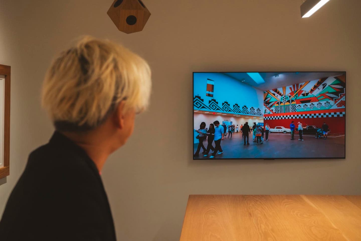 空間設計、照明、音響には相当こだわりました。ギャラリースペースの入口に設置した円筒は印刷機のシリンダーのイメージで、壁は曲面になっています。紙が印刷機を通っていくイメージの設計になっています。スポットライトは自動調光によって光が変わるようになっていて、午前中〜夕方は白い光、夕方〜夜は赤っぽい光になります。作品を買っていただいた後、ご自宅などで鑑賞した時のことを思い描いていただきやすいよう、さまざまな光の中で作品を見ていただくことができます。