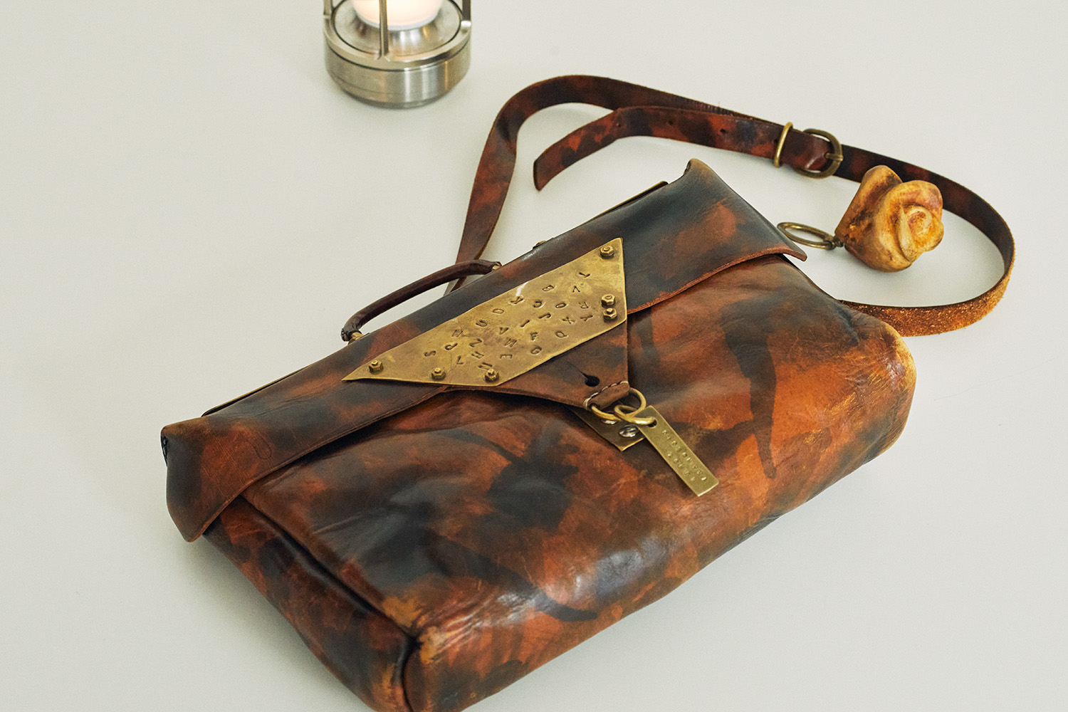 バッグは5トンの重さで革を圧縮、独自技法で着色し風合いを出している。バッグの右に置いてあるのが木製チャーム