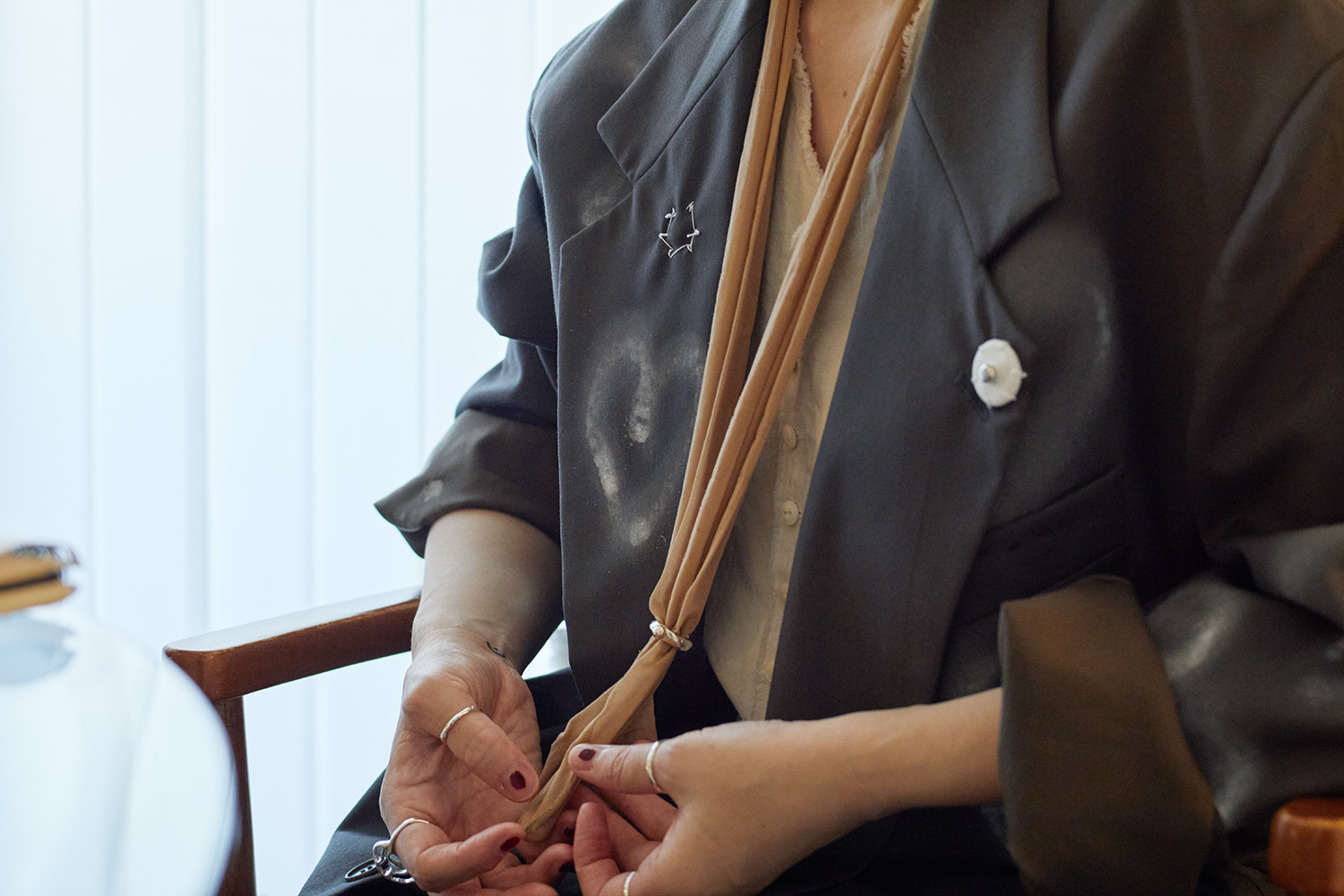 コム デ ギャルソンやパートナーからの影響もあって、作品づくりも変化してきているように感じます。2025秋冬シーズンの新作では、ストッキングを使ったネックレスをつくったんです。