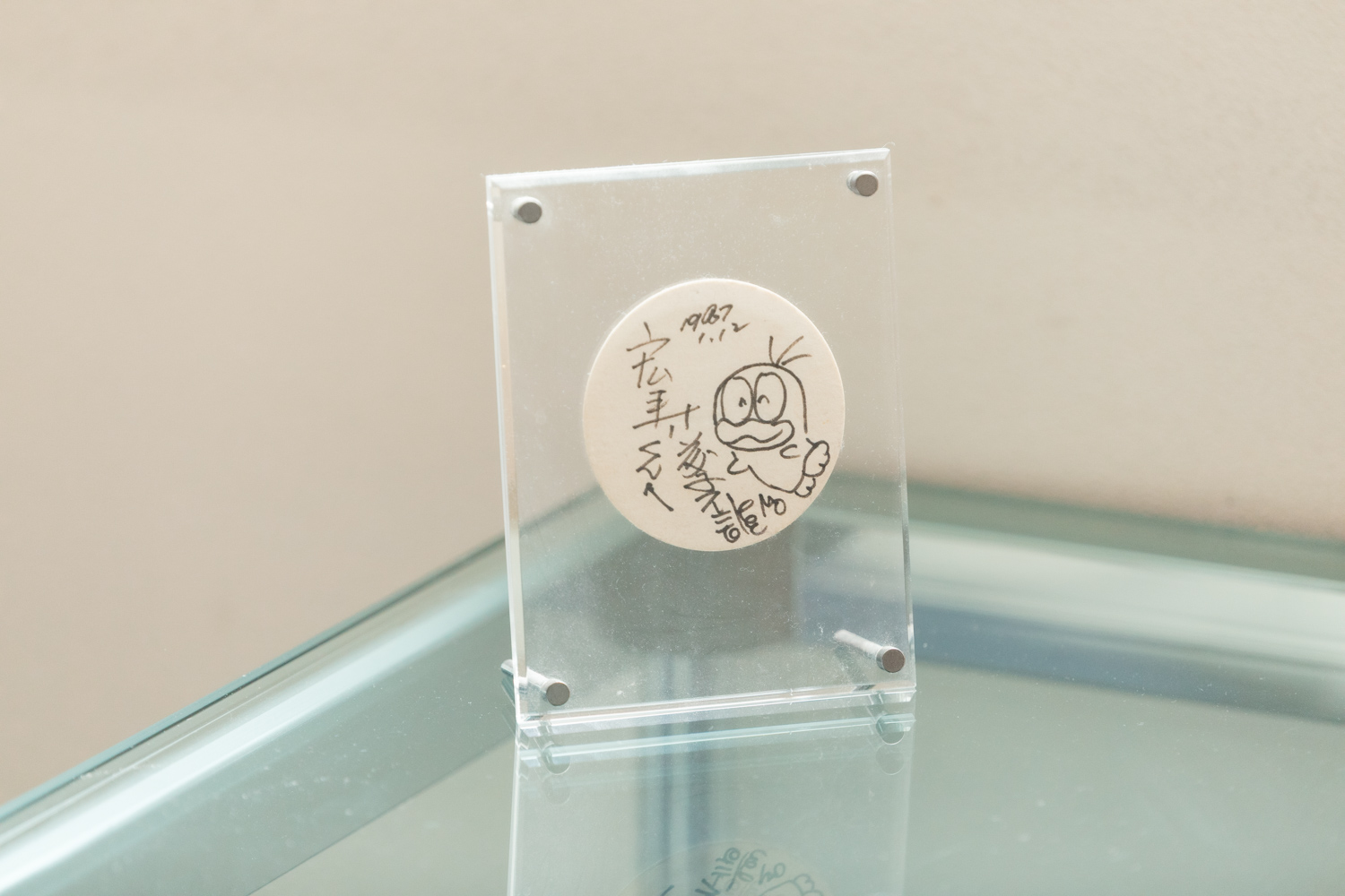 アクリルスタンドに収められているこちらのイラストは、僕が小学生の頃、藤子先生が描いてくださったオバケのQ太郎。お酒の席で父が、「息子が好きだから描いてよ」と頼んでくれたみたいです。