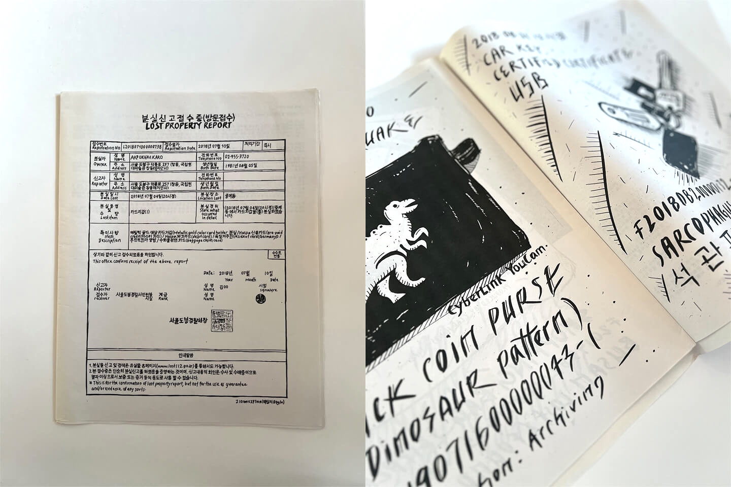 こちらのタブロイドは、Karo Akpokiereが韓国へ旅行した際、ソウルに到着して早々に財布を紛失(表紙はその紛失届)。韓国警視庁の紛失物管理システムに自分の財布があらわれるかどうかをひたすらチェックし続け、そこに表示された物品(誰かが紛失したが見つかったもの)を、描き続けたものだとか(なんと帰国後も2年間)。残念ながら、財布は見つからなかったらしいが、この作品群ができあがったそう。
