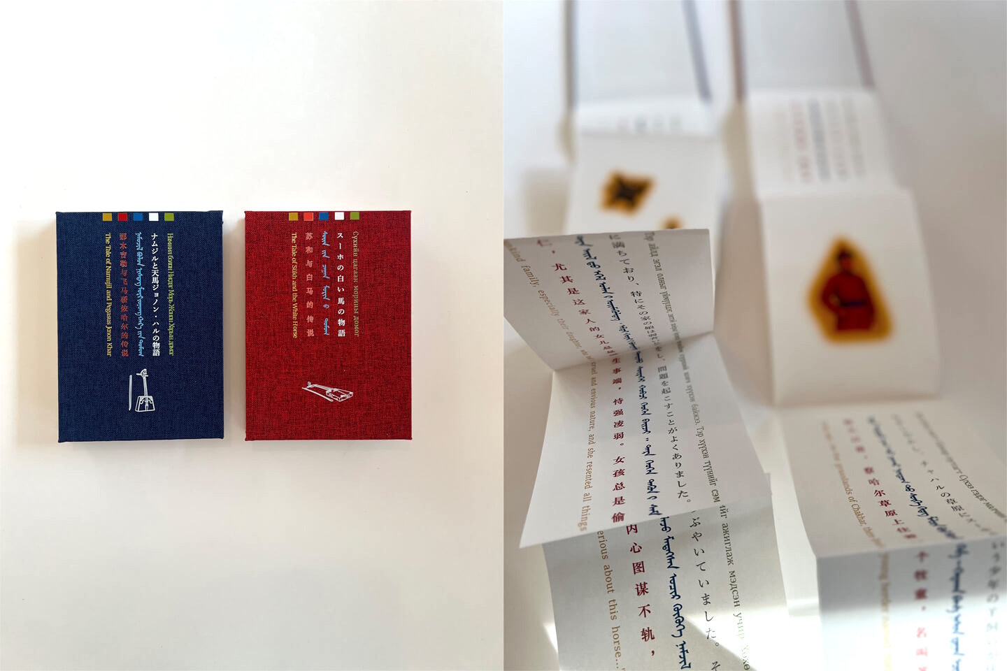 日本でもなじみが深い「スーホの白い馬」の物語には、ストーリー展開が異なる「ナムジルと天馬ジョノン・ハルの物語」もあるそう。それをモンゴル語(キリル文字)、日本語、モンゴル語(モンゴル文字)、中国語(漢字)、英語(アルファベット)が、チベット仏教の五色の祈祷旗(タルチョ)に着想を得たデザインで魅せる。