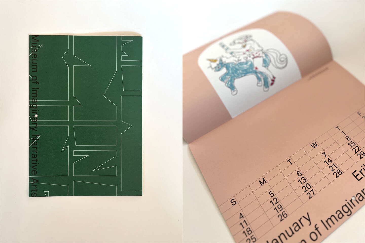入り口で無料配布していたMuseum of Imaginary Narrative Arts[MINA]のカレンダー。1月ページには干支の馬の絵を私も描かせていただいてます!