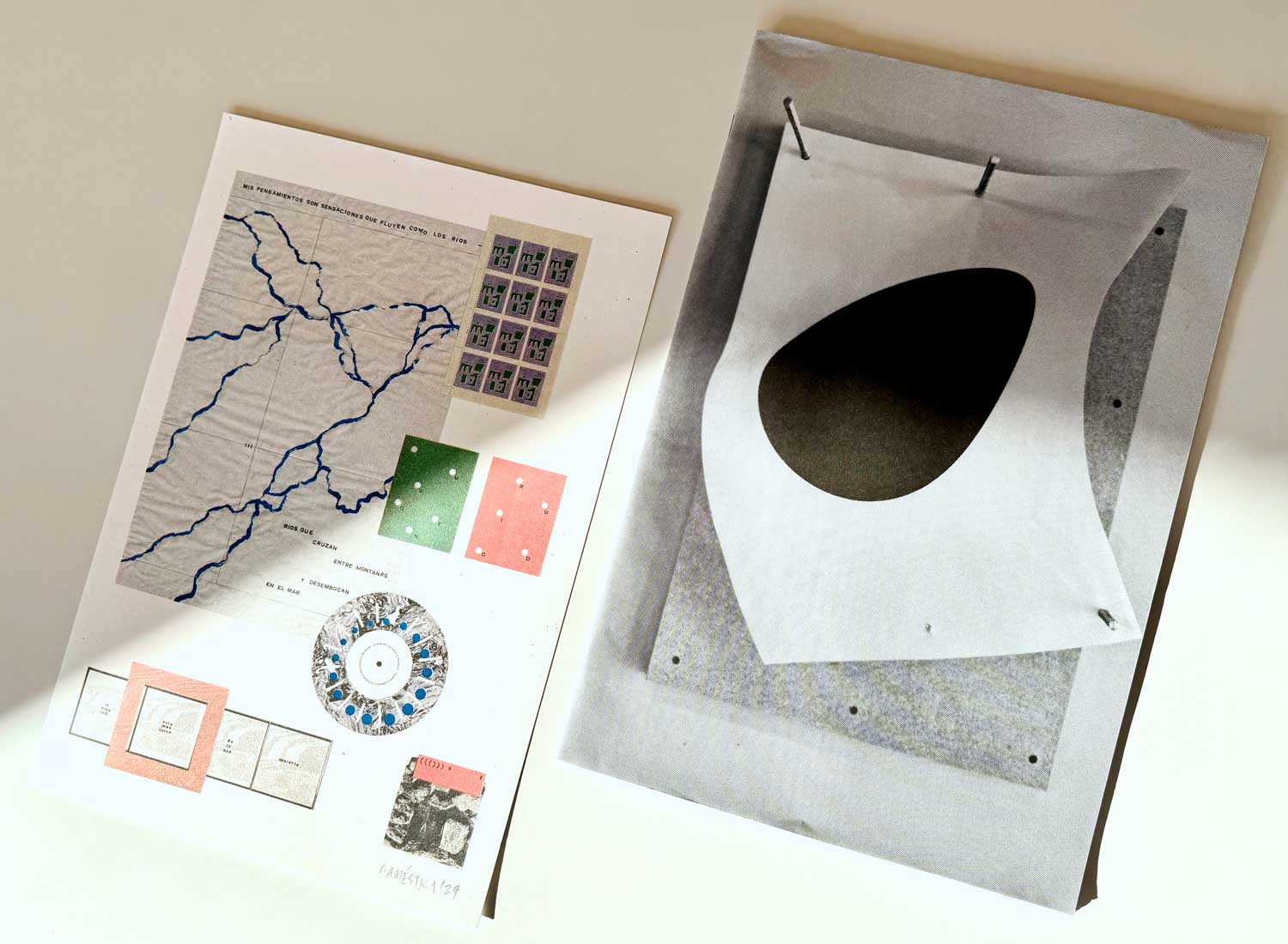 写真左からValentina Améstica『Relatos pasajeros』(2023/Calipso Press)11x16 size 4 riso inks Speckletone 100lb cover paper ¥2,500(5,000)※二枚セットで購入そのうちの1枚としてカウントしています、Kai Udema『ircle crcle cicle cirle circe circl (mantra)』(soft concern hard concern)32p 23×40cm riso printed 2022 €30(=5754.093円)