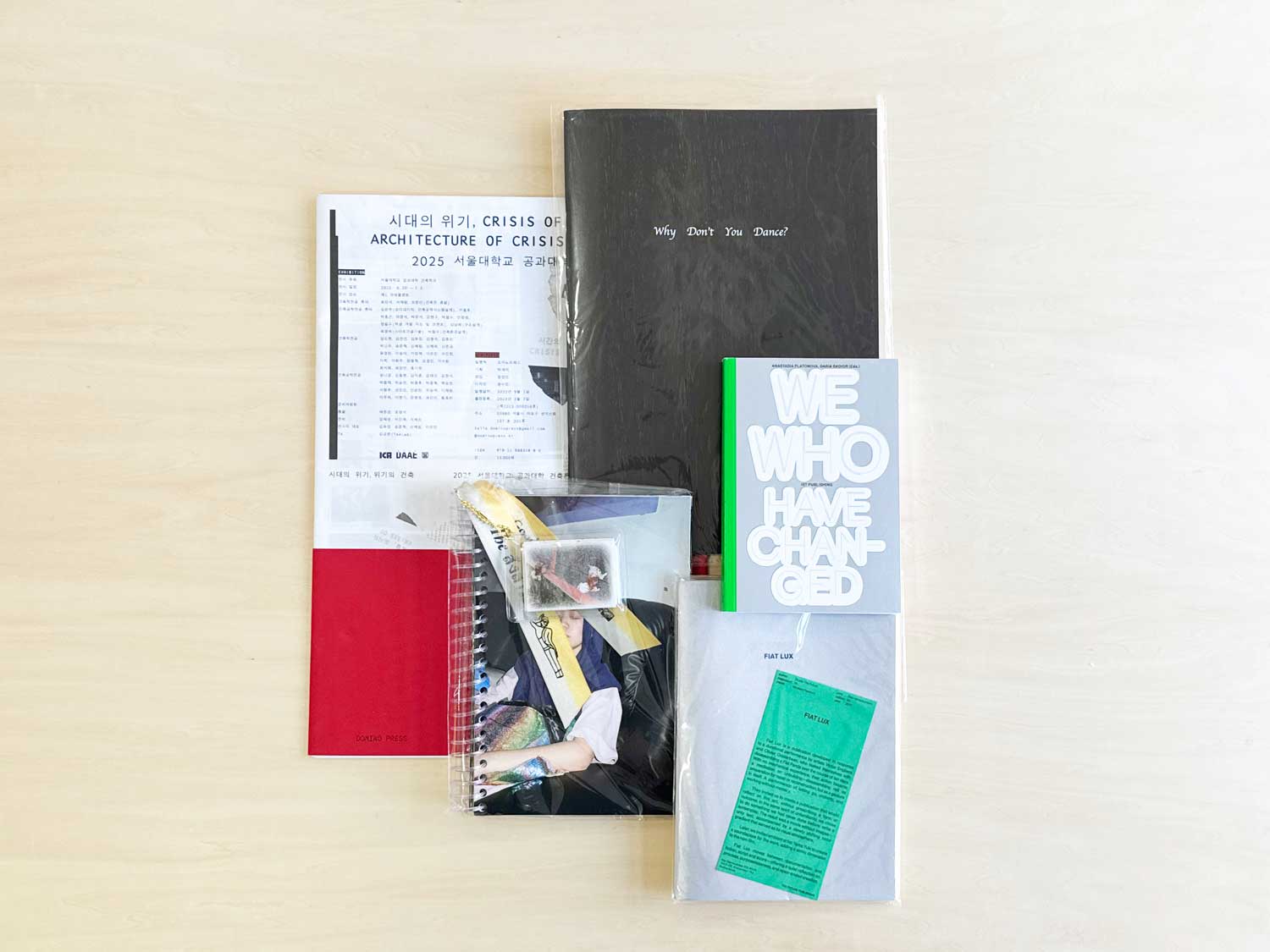 写真左は『CRISIS OF THE ERA, ARCHITECTURE OF CRISIS 』(Domino Press)、左下『The Goodwiller vol.5 "The สังสาระ"』(The Goodwiller)、右上『Why Don't You Dance? 』(18, Murata)、右中『WE WHO HAVE CHANGED 』(IST Publishing)、右下『FIAT LUX』(Studio The Future)