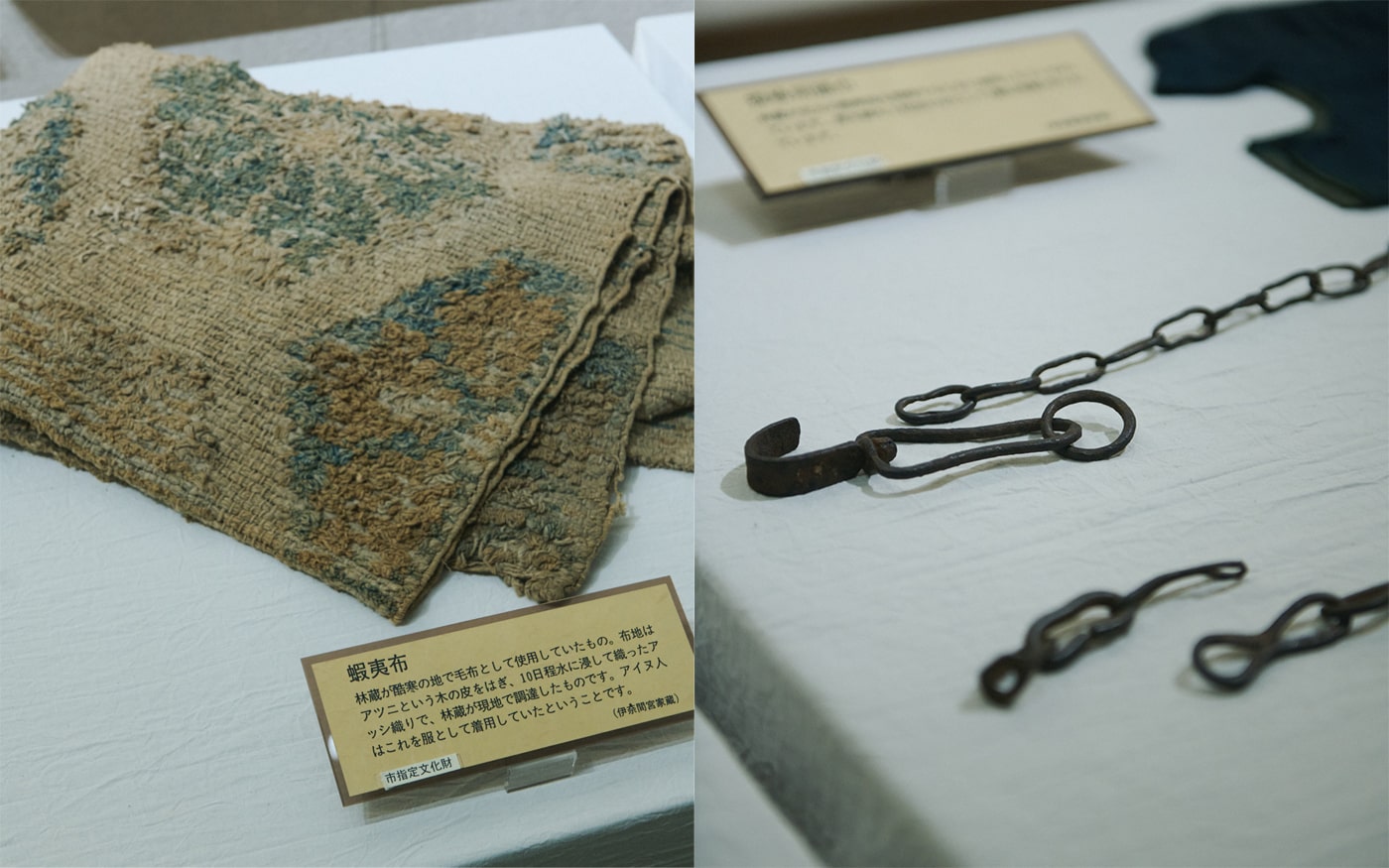 左/北方測量の際、現地で調達し寝具として使っていた蝦夷布。右/測量時に計測用として使われた鎖。「これらのギアを見ると、当時の調査がいかに過酷だったかが伝わってきます。今のように軽くて温かい装備はありませんから」