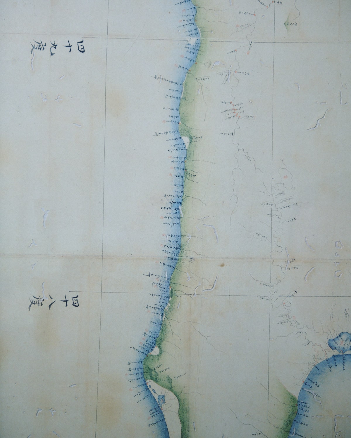 部屋の奥に展示されている樺太の地図です。最初、地図って気づかなかったんですよ。普通の地図には陸の部分や川がどう流れているのかとかが描いてあると思うのですが、これは海岸線しかないので地図であることが分からなかったんですね。でもこの地図は林蔵が歩いたり、舟から実際に見たものだけを記録してあるからこそ面白いんです。細かく名前が書いてあったり、絵として見ても線が綺麗です。また、これは最近の関心なのですが、海岸線が陸と海の「境界」であることにも興味を惹かれます。