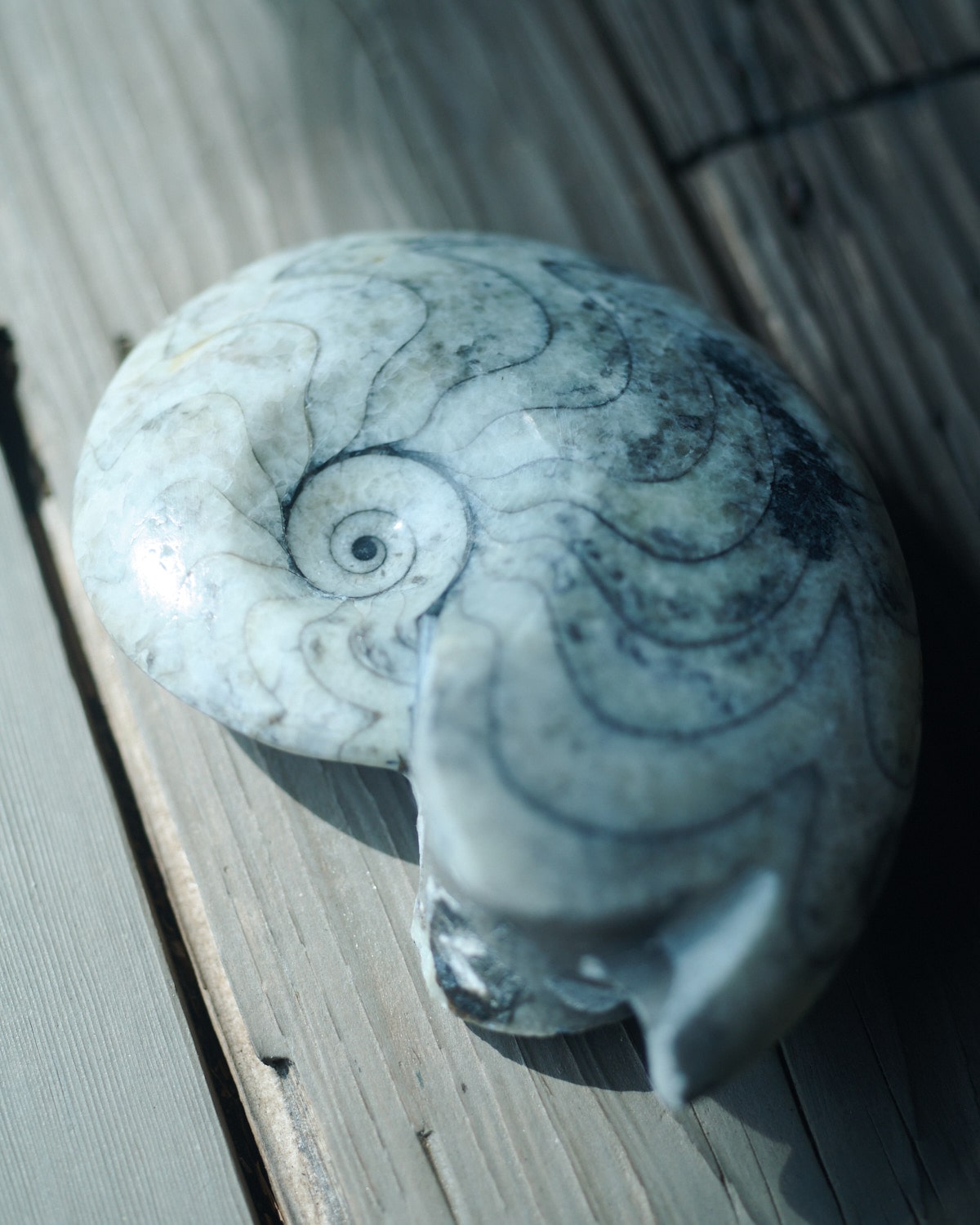 佐々木さんが取材現場に持参したアンモナイトの化石