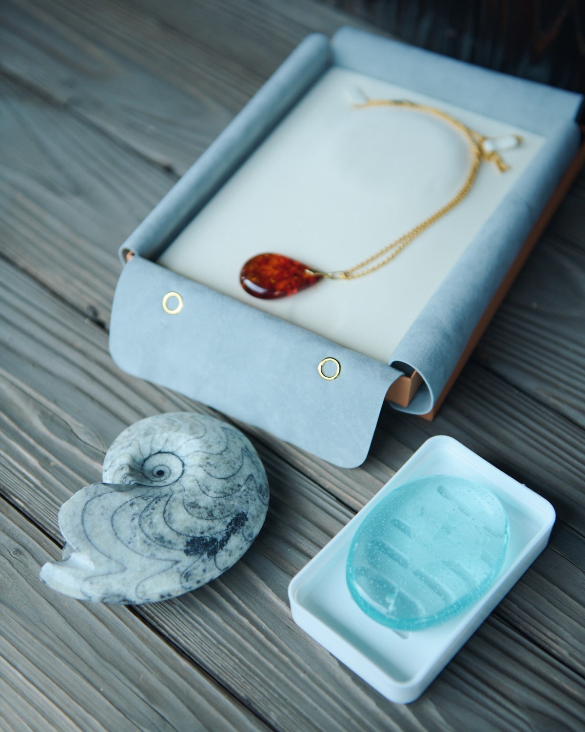 佐々木さんの私物の琥珀(上)とアンモナイトの化石(左)。石鹸トレーに入った青いガラスは「あいち2025」での発表作品。廃ガラスの中にイチョウ葉の灰がうっすらと見える