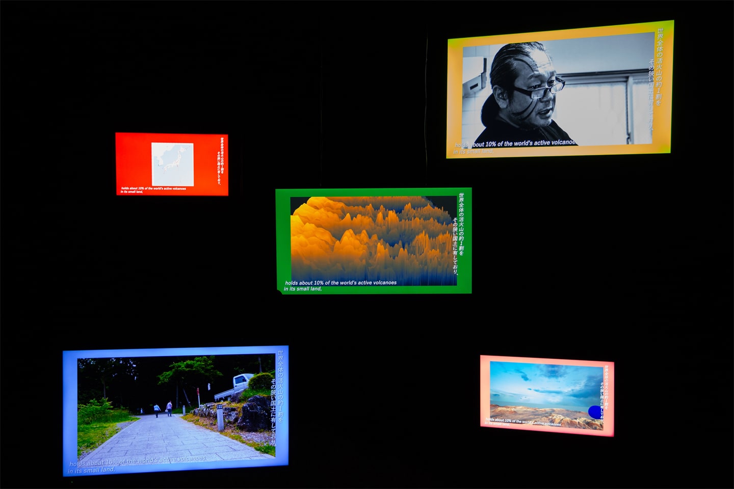《根源的不能性 Radical Impotency》では5つのモニターから諏訪の地形に迫る映像や、断層を頭部にタトゥーとして刻む辻さんの姿、過去の文献などが並列しながら展開される