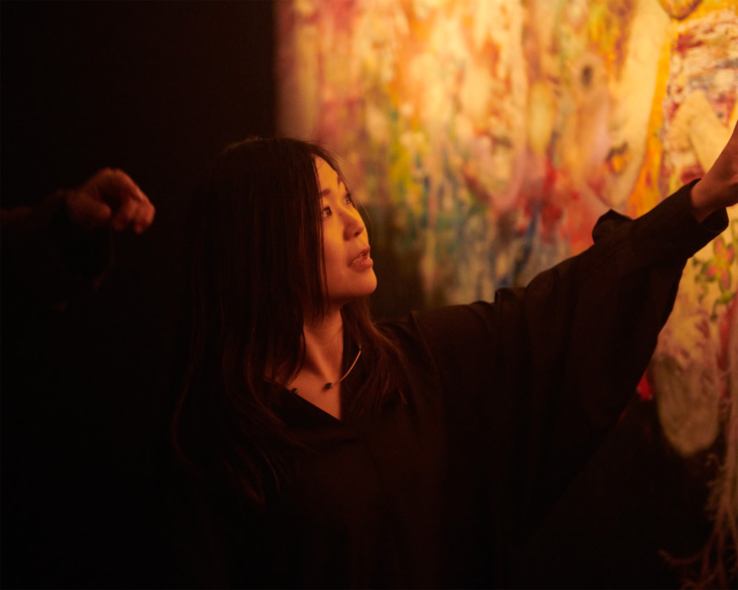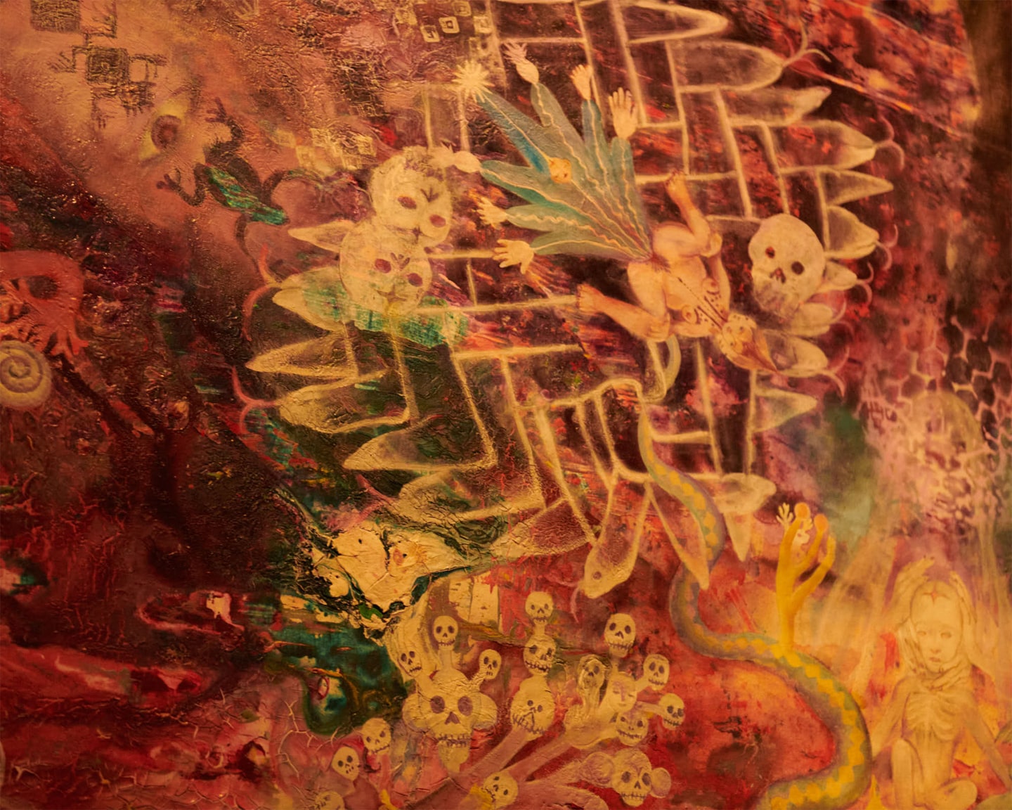 個展「あなたの胞衣はどこに埋まっていますか?」に展示された絵画作品《夢より深い覚醒》には、これまで大小島真木が触れてきた国内外の文化や宗教などのモチーフが散りばめられている