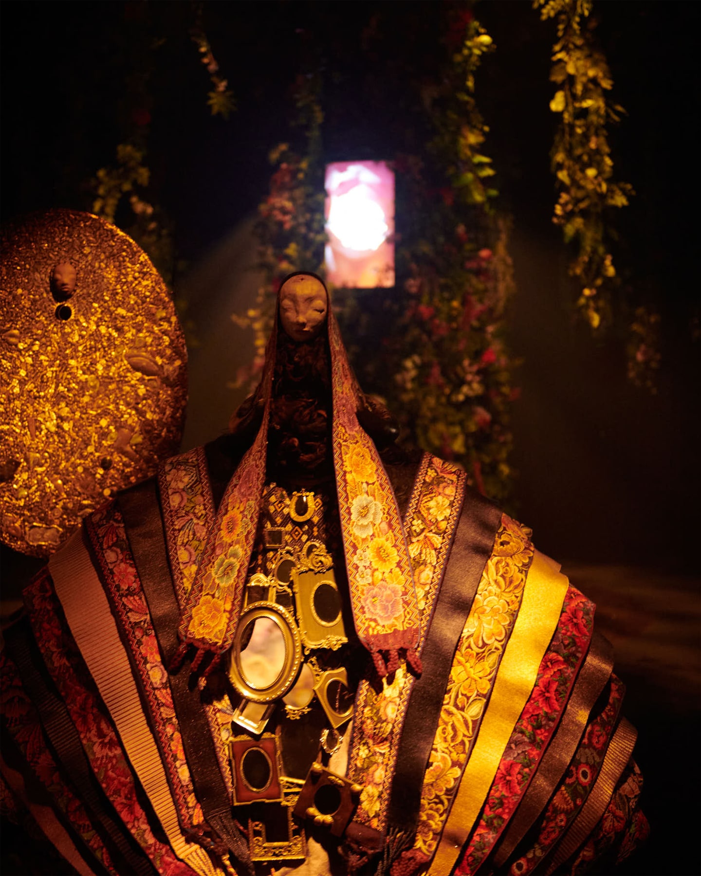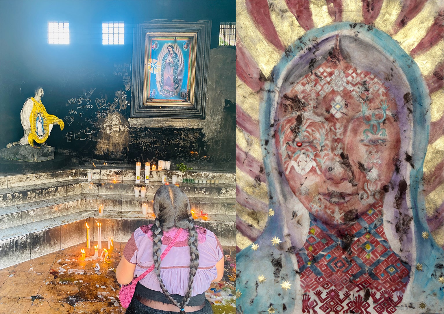 大小島:メキシコはスペインによって侵略され、植民地化された歴史を持つ土地です。滞在していたチアパス州は、キリスト教とマヤの信仰が入り混じったシンクレティズムの文化圏でした。人々はマリア像の前で祈りながら、その像にも自分たちの伝統衣装を幾重にも着せていて、その存在を自分たちの信仰の中に位置付けていた。その姿を見たとき、“どこからが伝統で、どこからが本物か”という境界はもはやないように感じました。むしろヨーロッパの教会よりも真剣に祈る人々が多くいることに驚かされました。今回のKAATでの個展でも、その経験をもとに「祈り」を一つのテーマとしたんです。