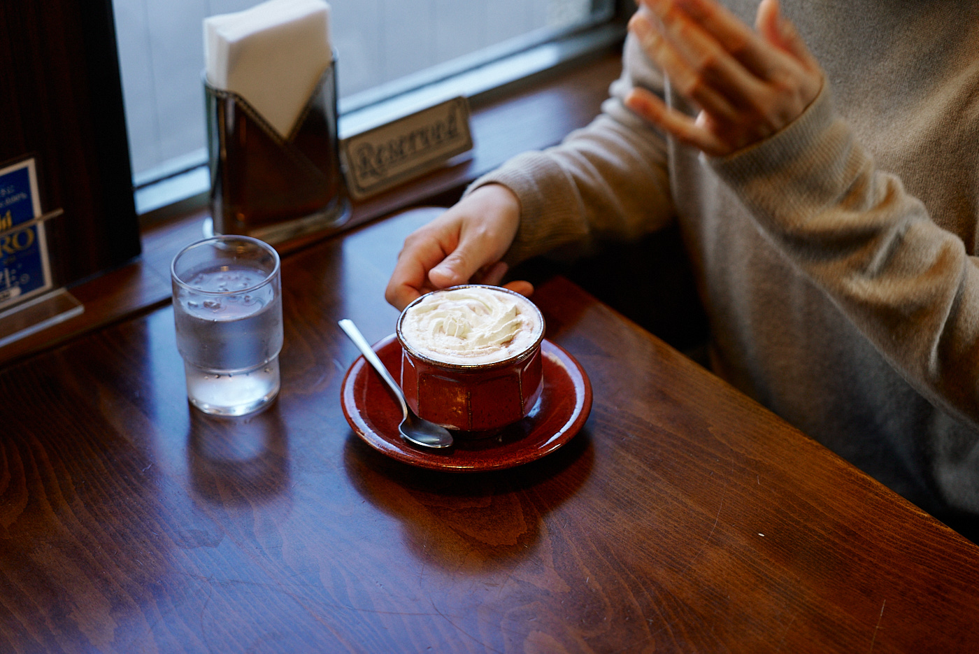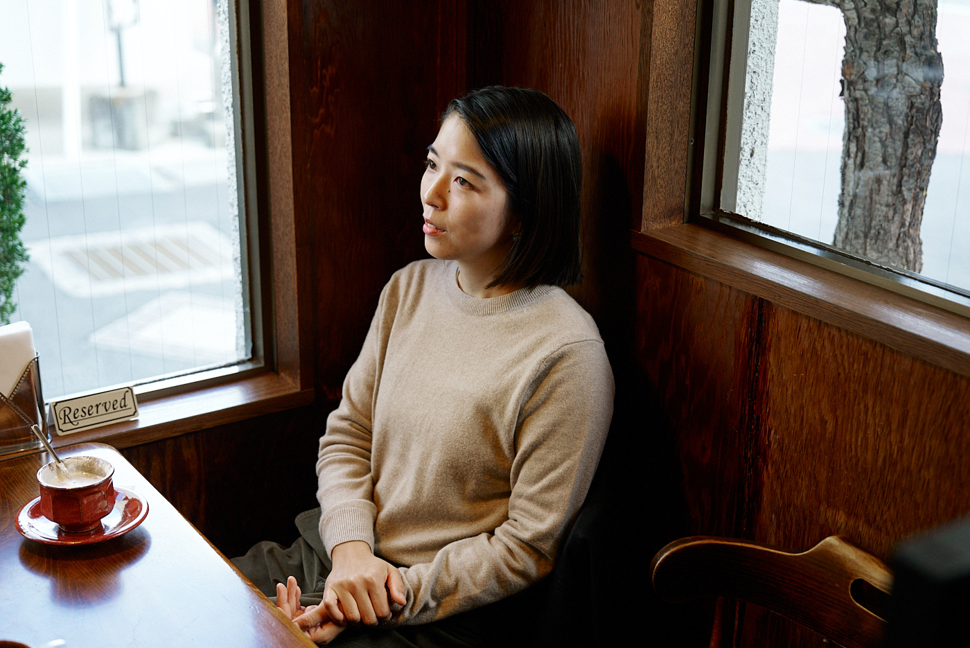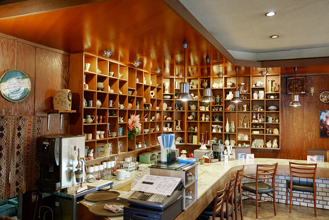 制作していて寒くなってきたら暖かいものを飲みに来るんですけど、定食とかもやっているので、お昼に食べにくる場合もあります。あとは陶芸の森に来ている作家のみんなで食べに来たり。信楽で一番古い喫茶店なので観光の人も来られるんですけど、地元の職人やアーティストも来ていて色々な情報が飛び交っているので、よく聞き耳を立てています(笑)。内装も落ち着く感じで、お皿やカップも素敵な陶器で出してくれるので、好きなお店です。