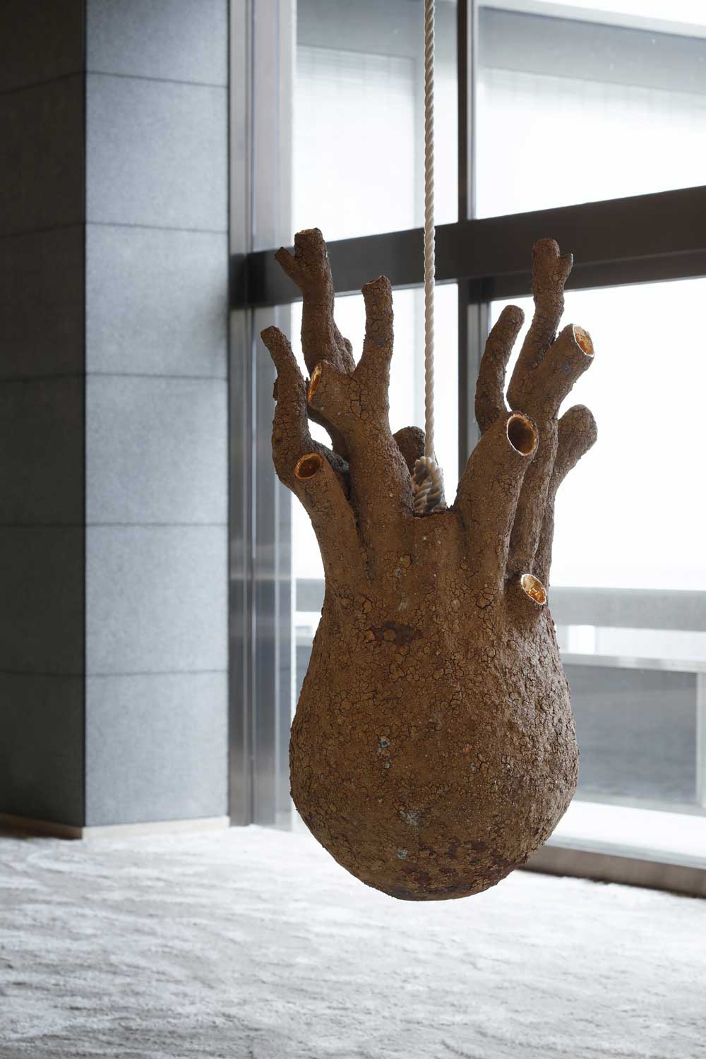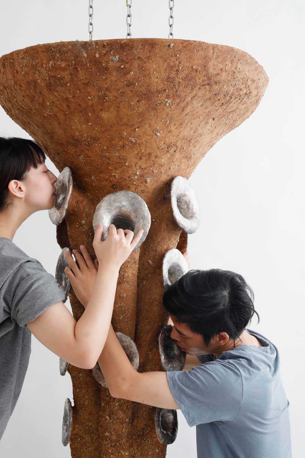 管が空洞になっており、陶器に頭を入れ吹き口に吹きかけることができる作品《沈黙と誘惑》(2021) Photo: Takeru Koroda Courtesy of ARTCOURT Gallery