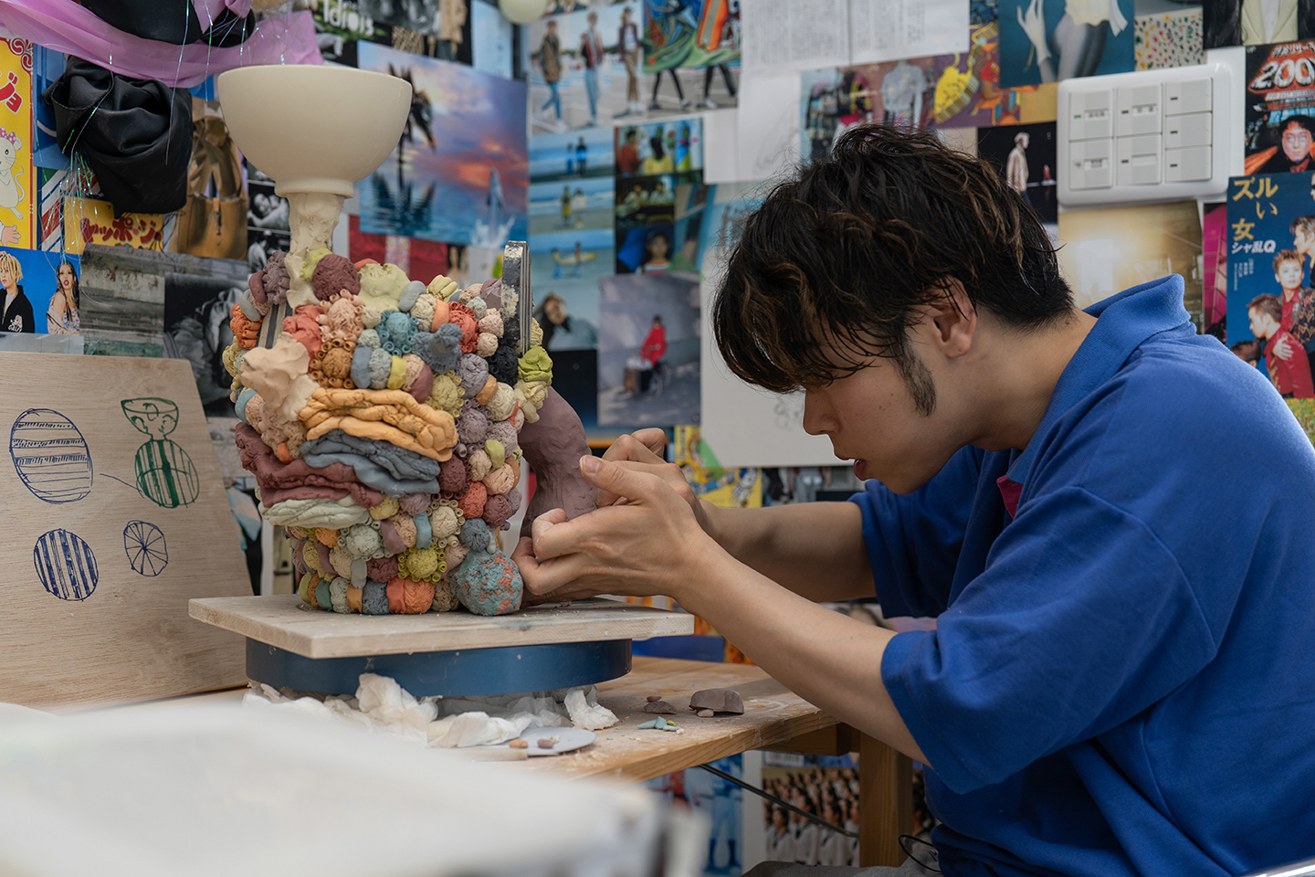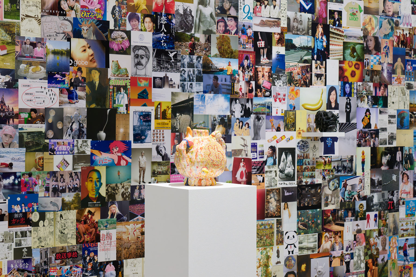 個展「神様、もう少しだけ」の様子。陶芸作品柄並ぶ会場の壁には川井さんが集めたエンタメやファッション、カルチャー作品のイメージが無数に貼られていた