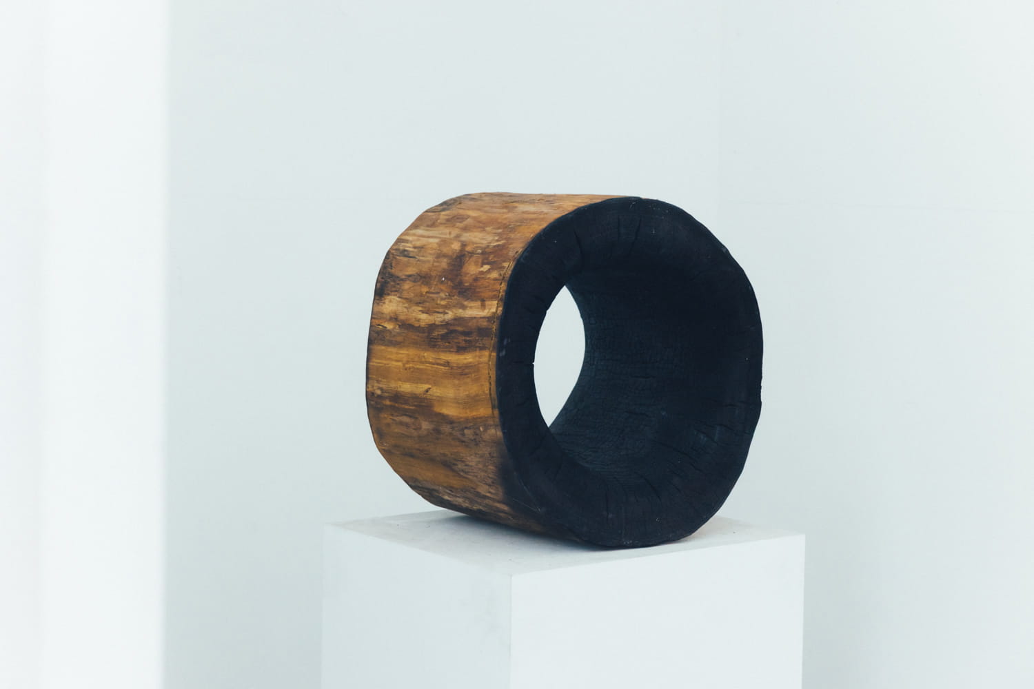 あの世とこの世の境界である「アフンルパㇽ」を知ったことから生まれた作品シリーズ『WORMHOLE』。直訳すると虫食い穴だが、時空を越えた場所とのつながりも意味する。木塊のコブや虫食い穴を活かし、木の表面や空洞の内部を焼くことで暗闇のイメージを与えている