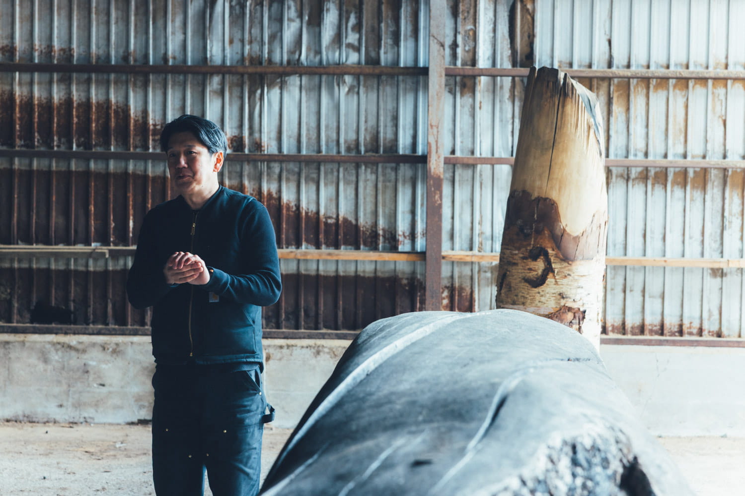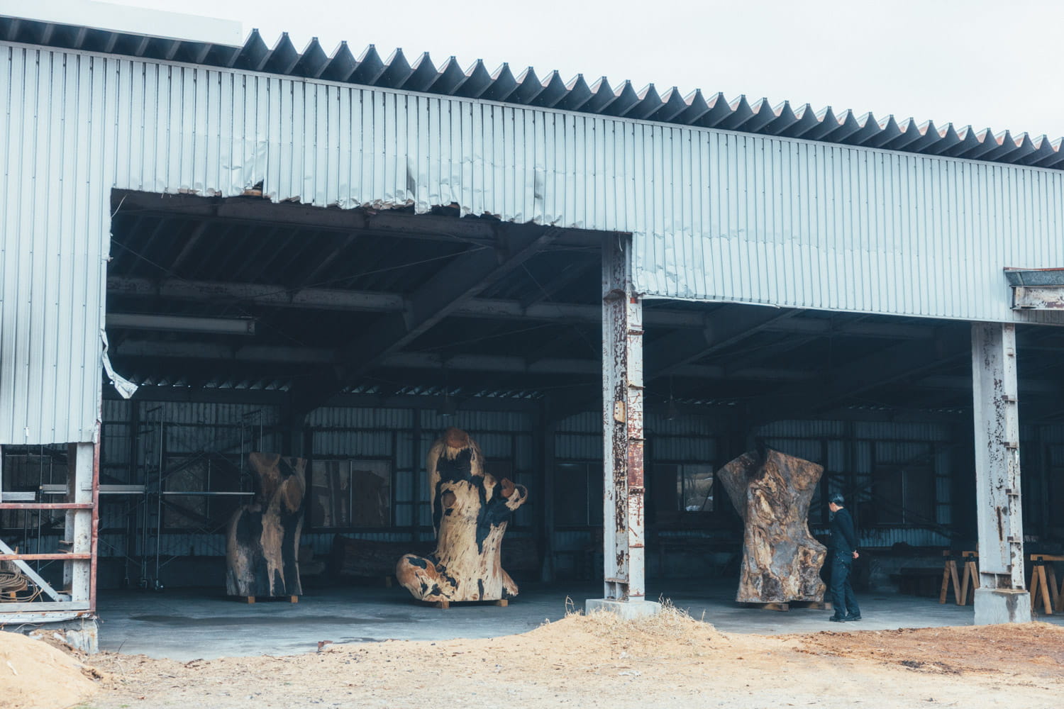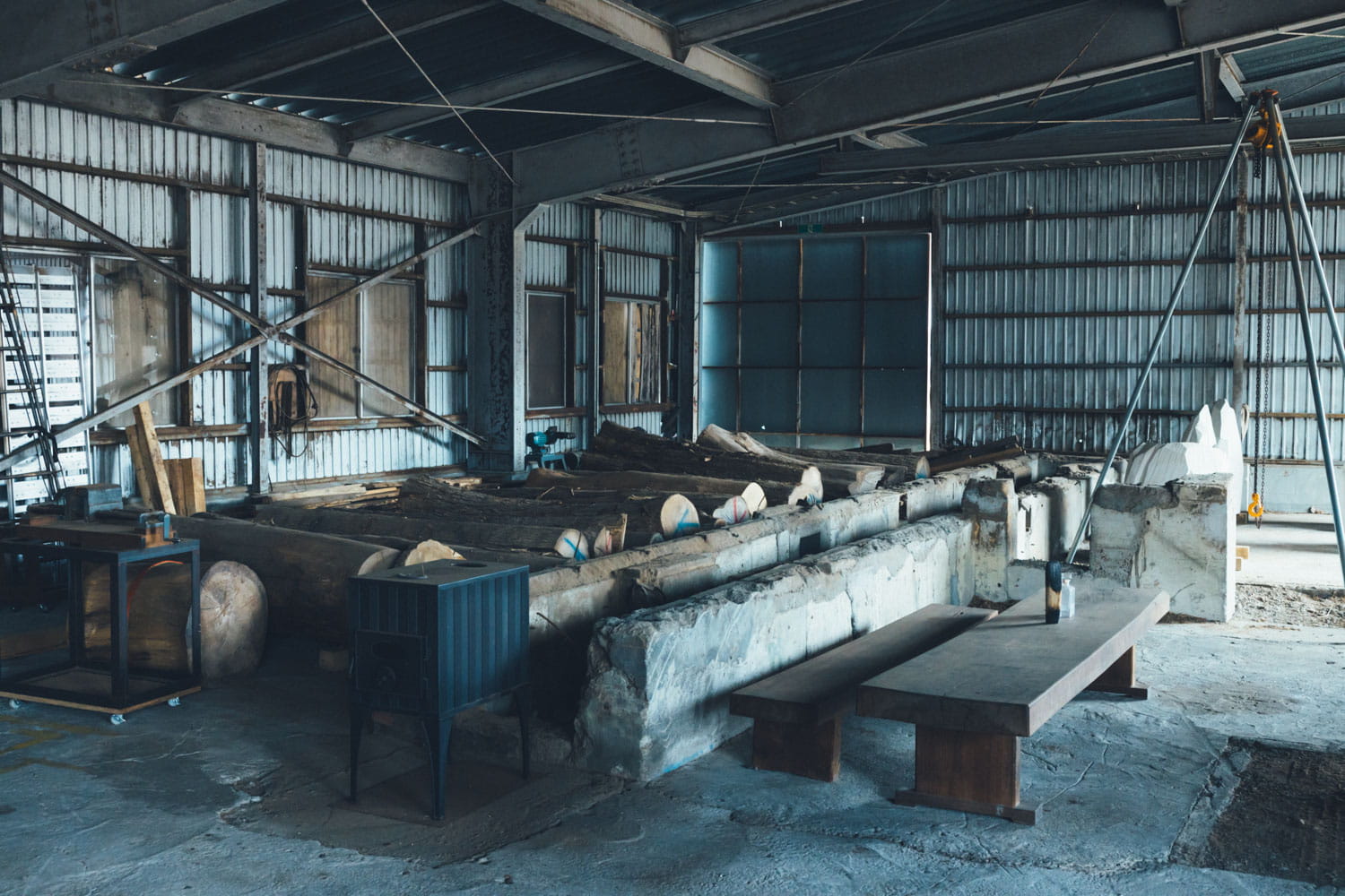 国松さんの拠点「飛生アートコミュニティー」の隣には、制作スタジオ「BLACKBIIRD STUDIO」も。1年半ほど前に古い整備工場を譲り受け、大型の彫刻制作などに使っている