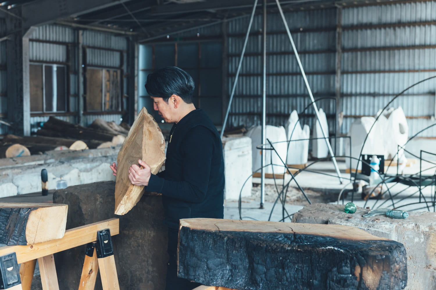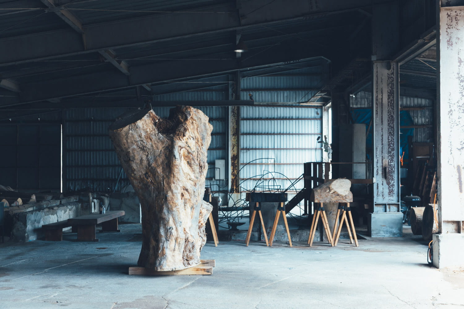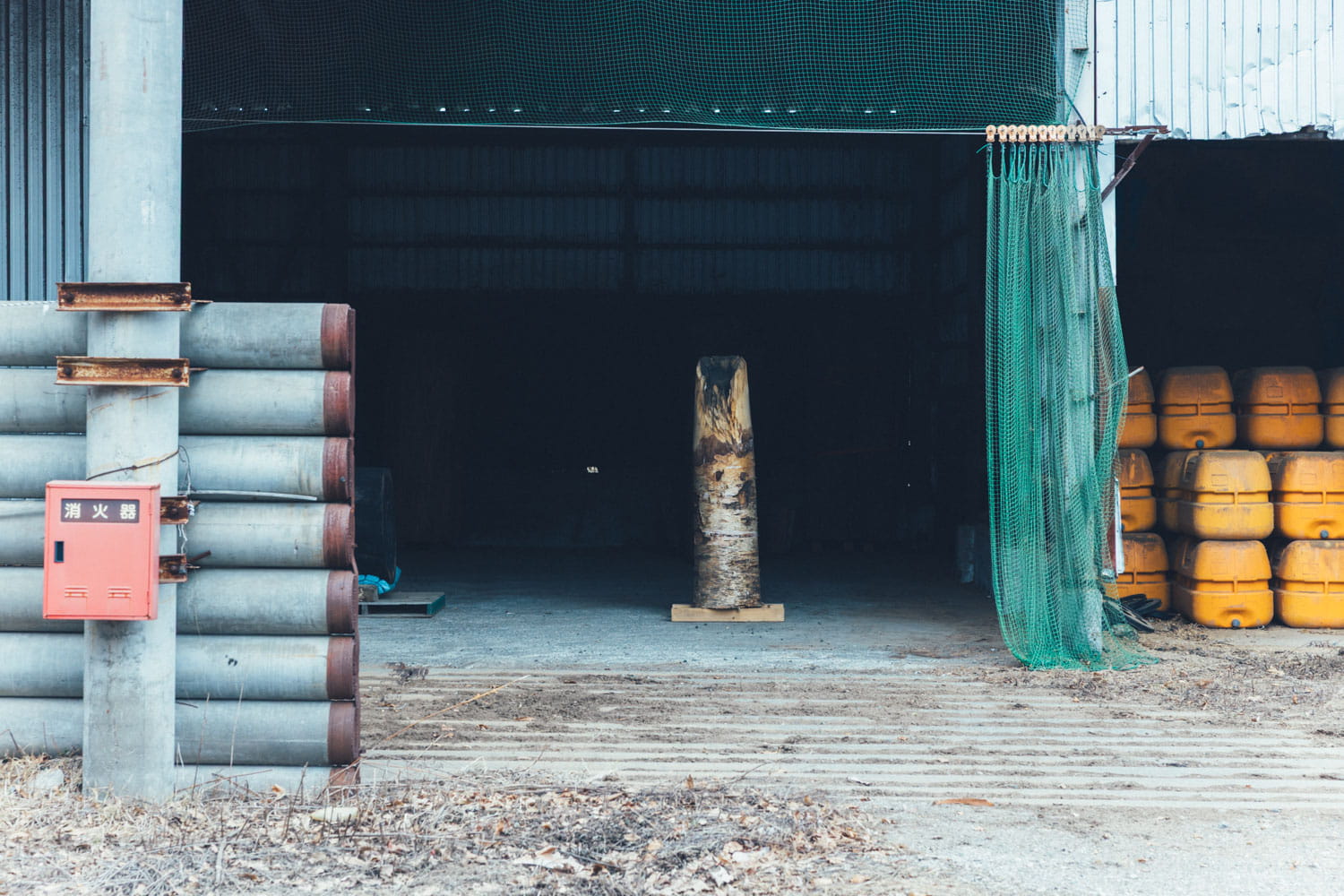 国松さんの拠点「飛生アートコミュニティー」の隣には、制作スタジオ「BLACKBIIRD STUDIO」も。1年半ほど前に古い整備工場を譲り受け、大型の彫刻制作などに使っている