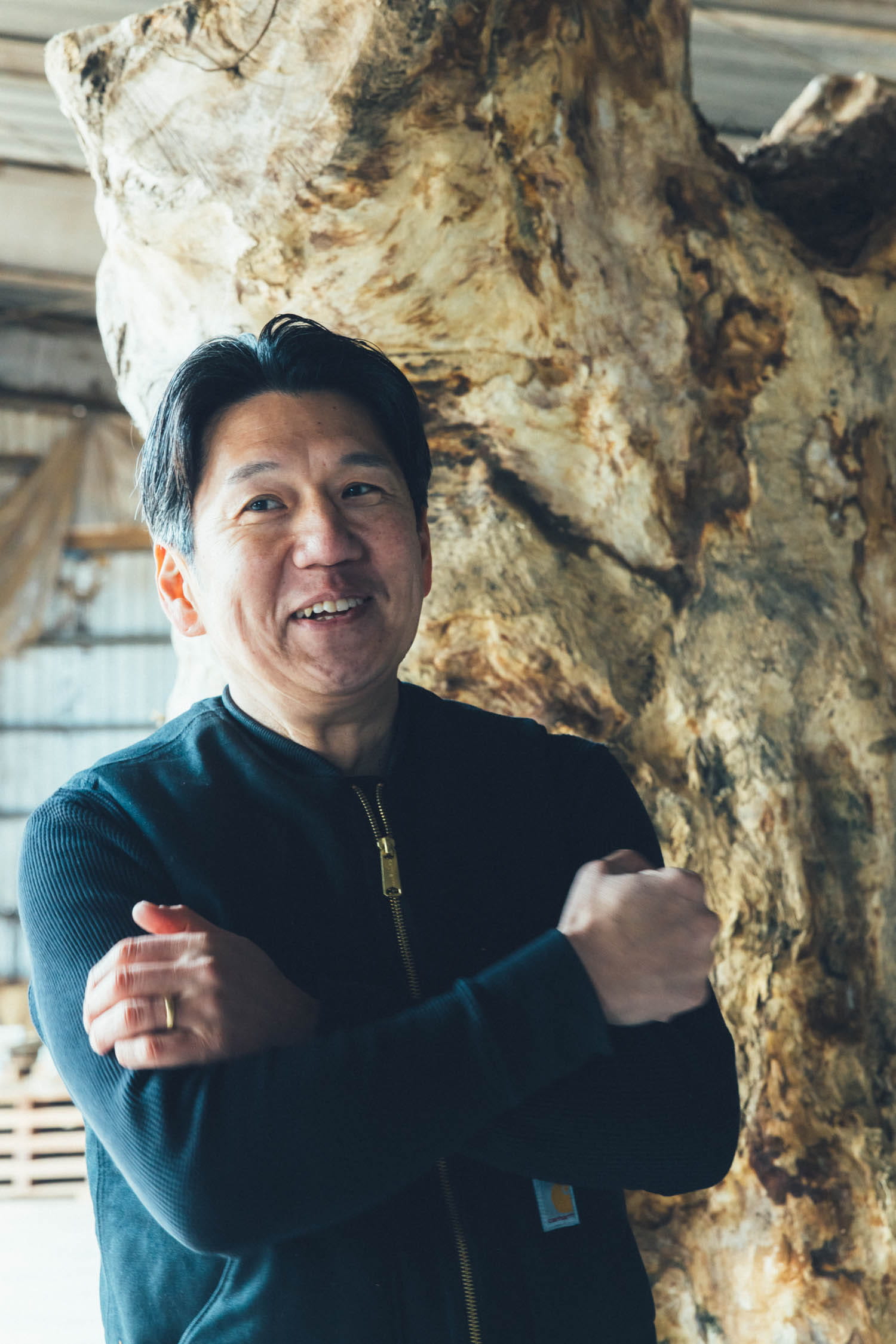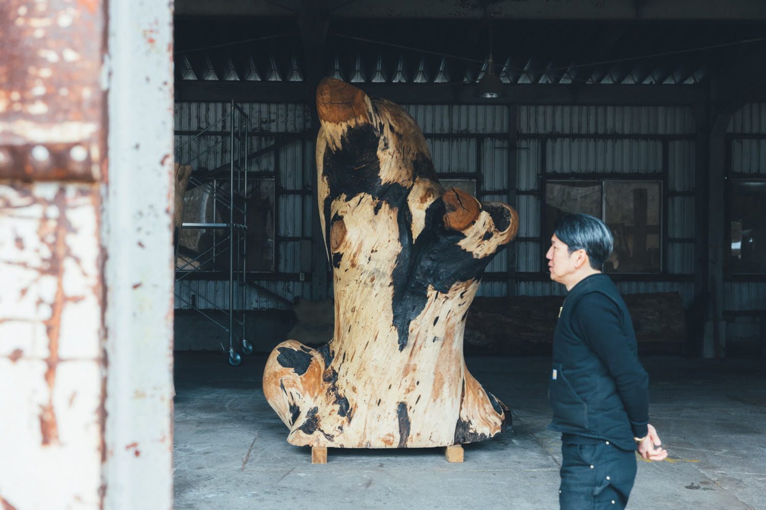 作品を作る時は、最初から何かをイメージするんじゃなくて、木を見て浮かんでくる感覚を大事にしたい。なので、木を選ぶ段階から、形の面白さや存在感の強さみたいなものは意識しています。そういう木と向き合ううちに、「この部分を落としたら、形がいっそう際立って面白いんじゃないかな」と思い、やってみる。すると次の段階が見えてきて、また手を加える。そんな感じです。