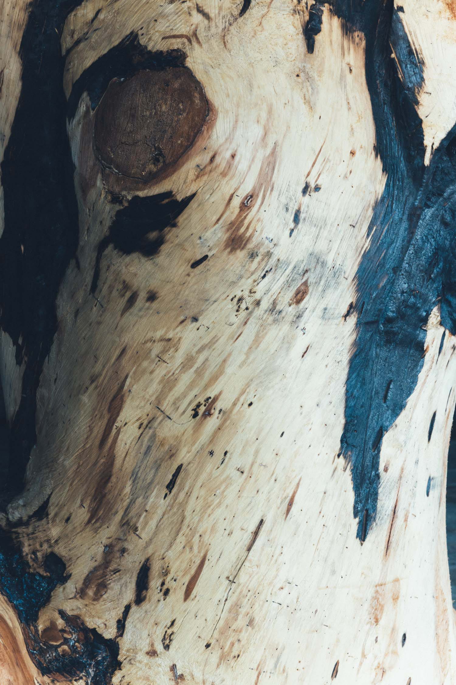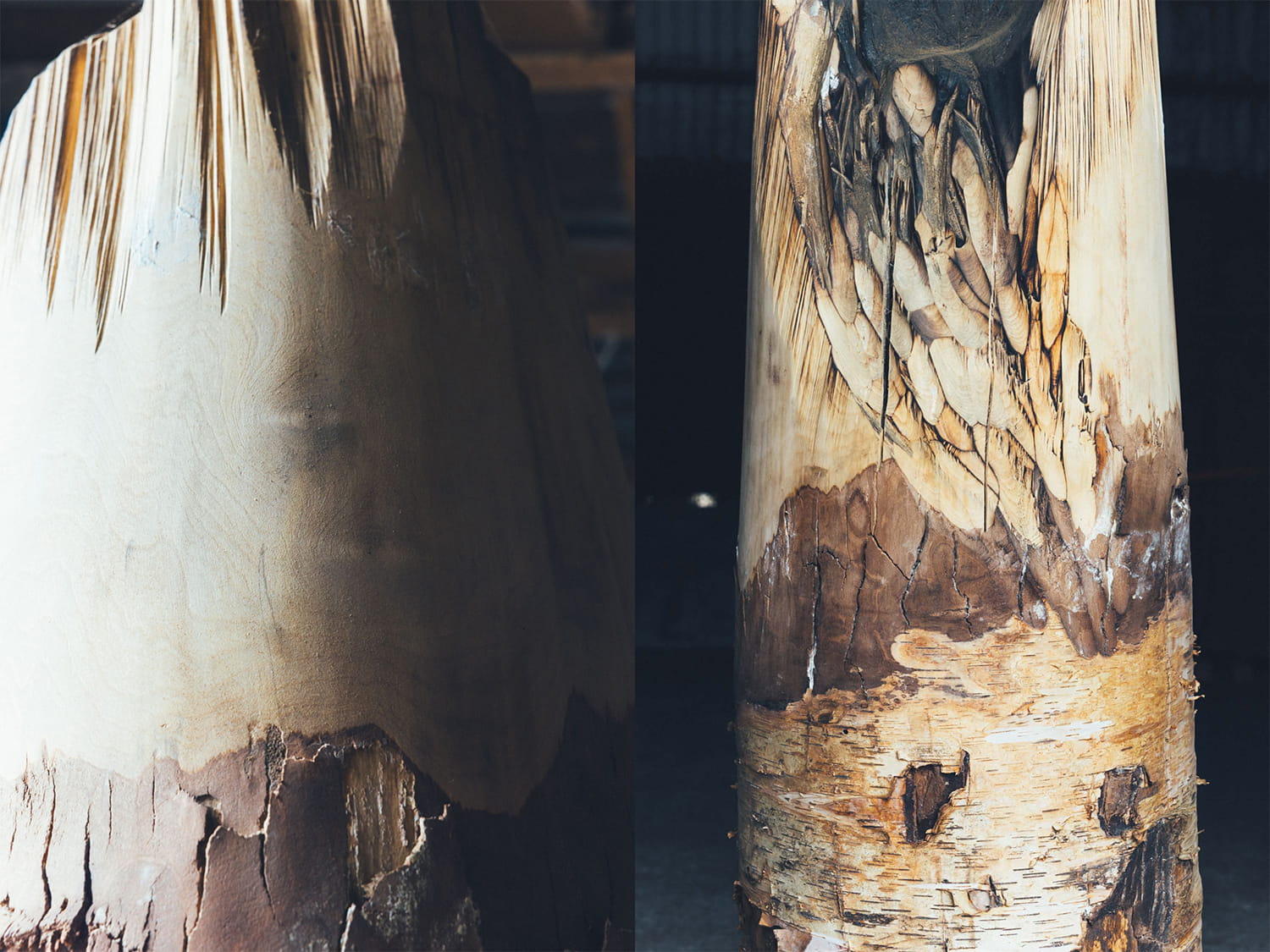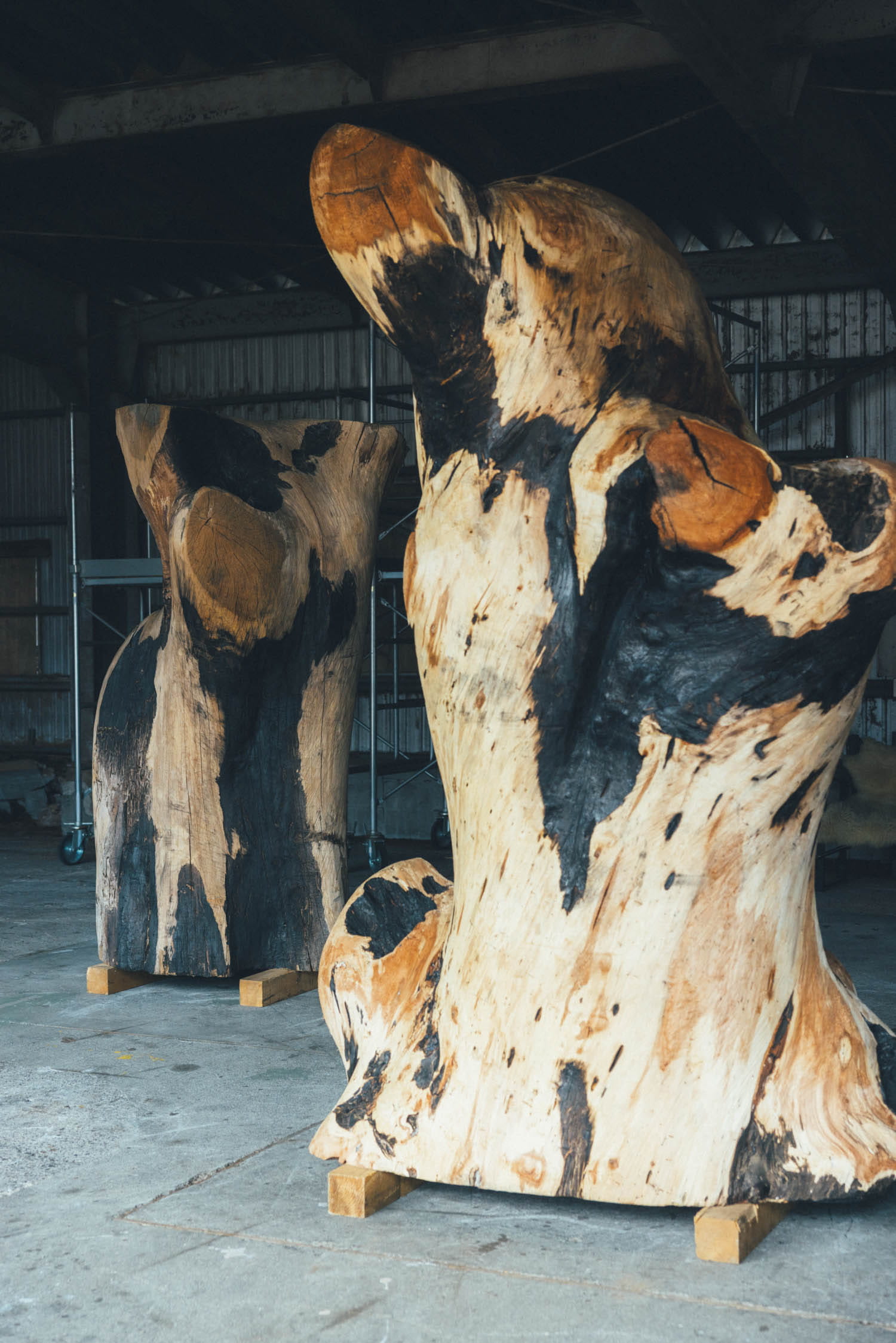 チェーンソーで形づくった後、断面をバーナーで焼いて変色させ、その後、再び削ることもある