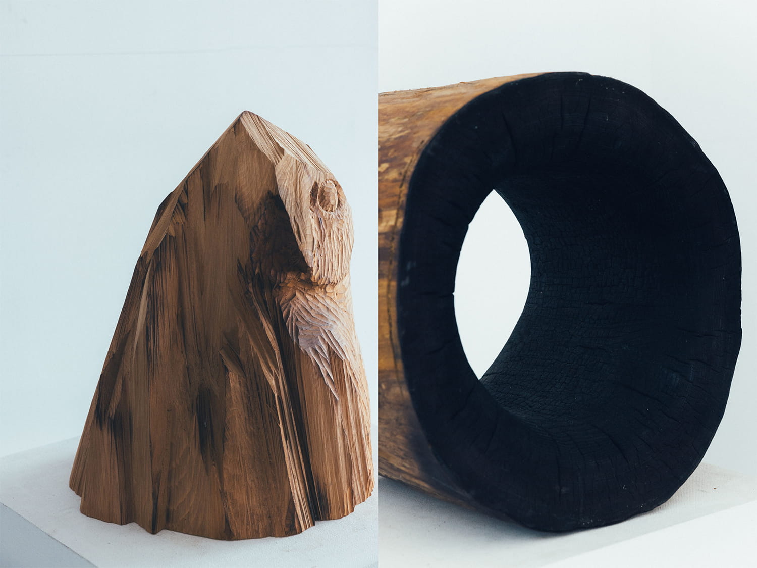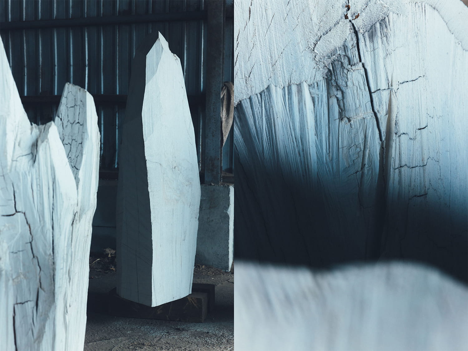 アトリエで制作途中の作品は代表作のひとつ、『GLACIER MOUNTAIN』シリーズ。温度や風化によって変化する雪山や氷山などの、ある一瞬をとどめた彫刻。具体的な山をモチーフにしたのではなく、木の形状や材質と向き合った時間から生まれる新たな風景だ