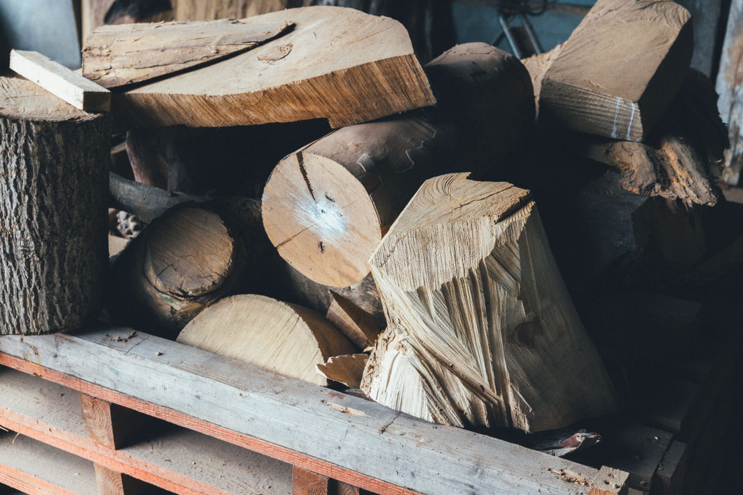 スタジオには、制作前の丸太や木塊も。木材は製材所で選んだり、旭川の銘木市に行って購入したりする。樹齢数百年という大木や、川底に長い間埋まって緑色っぽく変色した埋もれ木も。割れやフシがあるため家具にはできず、砕いてチップや紙にされるはずだった、というような木も多い