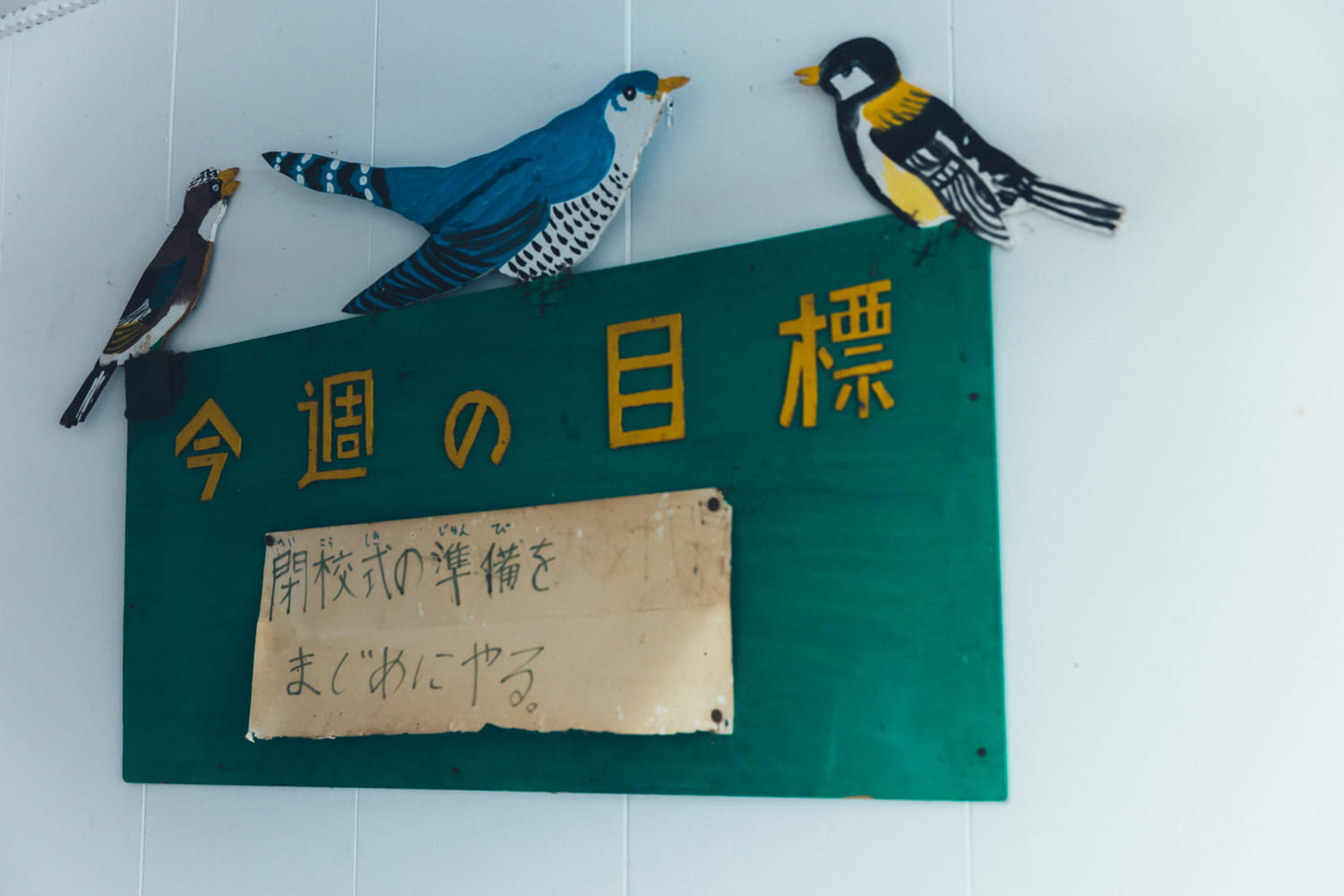 飛生小学校は、鳥の鳴き声の研究などを行う‶愛鳥モデル校〟としても知られていた。教室内には鳥の工作もたくさん残っている