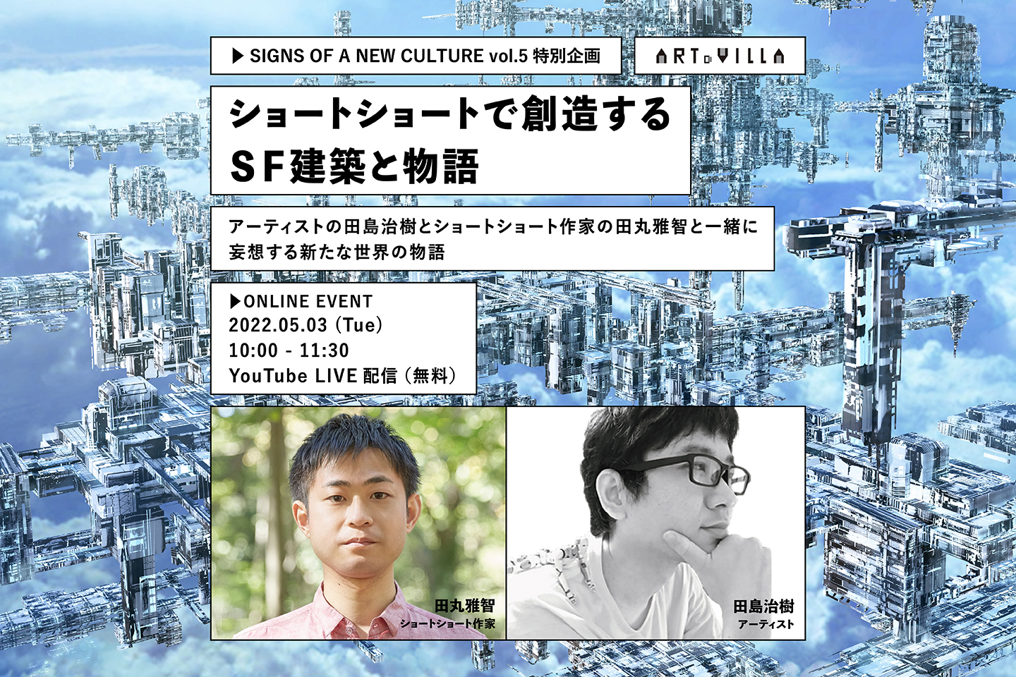 2022年4月28日(木)〜5月11日(水)までGINZASIX 5Fアールグロリューにて開催される「SIGNS OF A NEW CULTURE vol.5」の特別企画として、「ショートショートで創造するSF建築と物語」〜アーティストの田島治樹とショートショート作家の田丸雅智と一緒に妄想する新たな世界の物語〜を開催いたします。誰でもショートショートを作れるメソッドに沿って、言葉のカードを組み合わせて物語のタイトルを作成、そのタイトルを元に世界を妄想します。イベント中はチャットから二人の妄想に加わることも可能です。皆さんも二人と一緒にまだ見ぬ新たな世界を創造してみませんか?